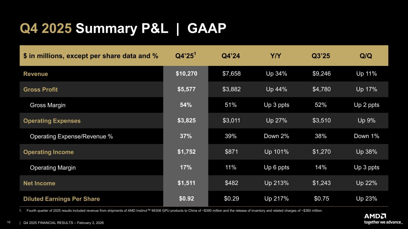 10 | | 2025年第四季度财务业绩– 2026年2月3日2025年第四季度损益表摘要| GAAP百万美元,每股数据和% Q4‘251 Q4’24 Y/Y Q3 ' 25 Q3/Q收入$ 10,270 $ 7,658增长34% $ 9,246增长11%毛利润$ 5,577 $ 3,882增长44% $ 4,780增长17%毛利率54% 51%增长3个百分点52%增长2个百分点营业费用$ 3,825 $ 3,011增长27% $ 3,510增长9%营业费用/收入% 37% 39%下降2% 38%下降1%营业收入$ 1,752 $ 871增长101% $ 1,270增长38%营业利润率17% 11%增长6个百分点14%增长3个百分点净收入$ 1,511 $ 482增长213% $ 1,243增长22%稀释后每股收益$ 0.92 $ 0.29增长217% $ 0.75增长23% 1。2025年第四季度业绩包括AMD Instinct MI308 GPU产品对华出货量约3.9亿美元的收入,以及约3.6亿美元的库存和相关费用的释放。