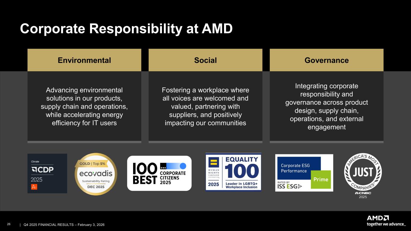 26 | | 2025年第四季度财务业绩– 2026年2月3日AMD Environment的企业责任在我们的产品、供应链和运营中推进环境解决方案,同时加速IT用户的能源效率社交培养一个所有声音都受到欢迎和重视的工作场所,与供应商合作,并对我们的社区治理产生积极影响,整合跨产品设计、供应链、运营和外部参与的企业责任和治理