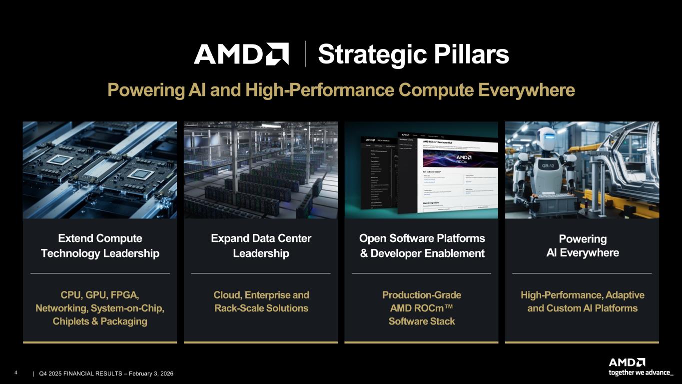 4 | | 2025年第四季度财务业绩– 2026年2月3日,为AI和高性能计算无处不在提供动力的战略支柱高性能、自适应和定制的AI平台为无处不在的AI提供动力云、企业和机架级解决方案扩大数据中心领先的生产级AMD ROCM软件堆栈开放软件平台和开发者支持CPU、GPU、FPGA、网络、系统级芯片、Chiplet和封装扩大计算技术领先地位