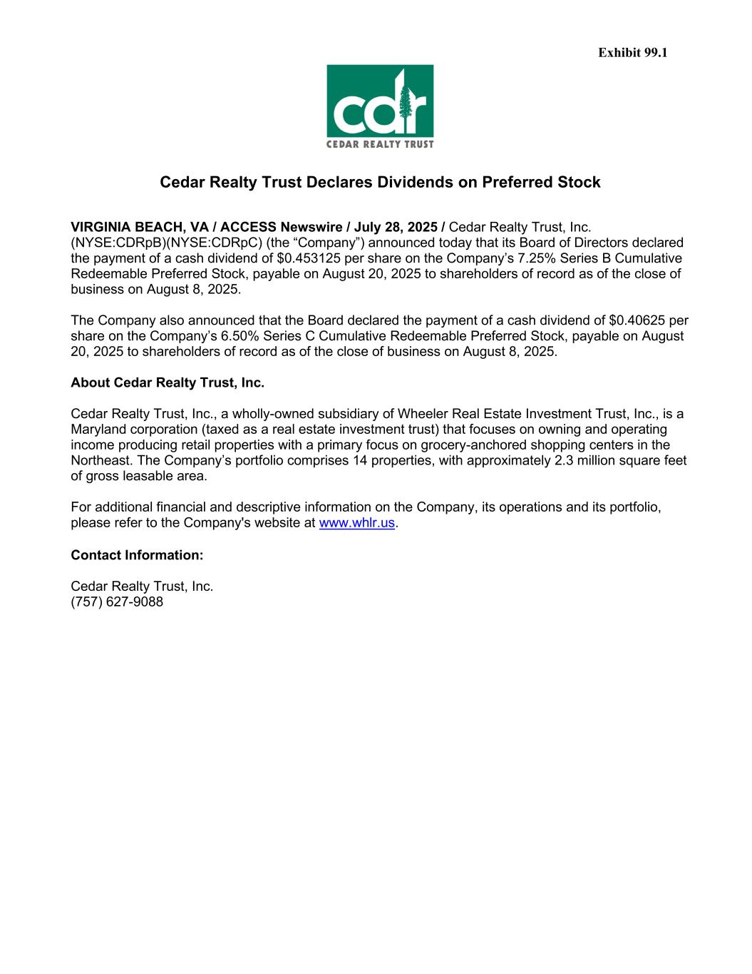 附件 99.1 雪松房地产信托宣布就优先股VIRGINIA BEACH,VA/ACCESS丨/2025年7月28日/Cedar Realty Trust, Inc.(NYSE:CDRPB)(NYSE:CDRPC)(“公司”)宣布,其董事会宣布就公司的7.25% B系列累积可赎回优先股支付每股0.453125美元的现金股息,将于2025年8月20日支付给截至2025年8月8日营业结束时登记在册的股东。该公司还宣布,董事会宣布支付公司6.50% C系列累积可赎回优先股每股0.40625美元的现金股息,将于2025年8月20日支付给截至2025年8月8日营业时间结束时登记在册的股东。关于Cedar Realty Trust, Inc.Cedar Realty Trust, Inc.是丨惠勒房地产投资信托公司Wheeler Real Estate Investment Trust, Inc.的全资子公司,是马里兰州的一家公司(按房地产投资信托征税),专注于拥有和经营产生收入的零售物业,主要关注东北部以杂货为主的购物中心。该公司的投资组合包括14处物业,总可出租面积约为230万平方英尺。有关公司、运营和投资组合的更多财务和描述性信息,请参阅公司网站www.whlr.us。联系方式:Cedar Realty Trust, Inc.(757)627-9088