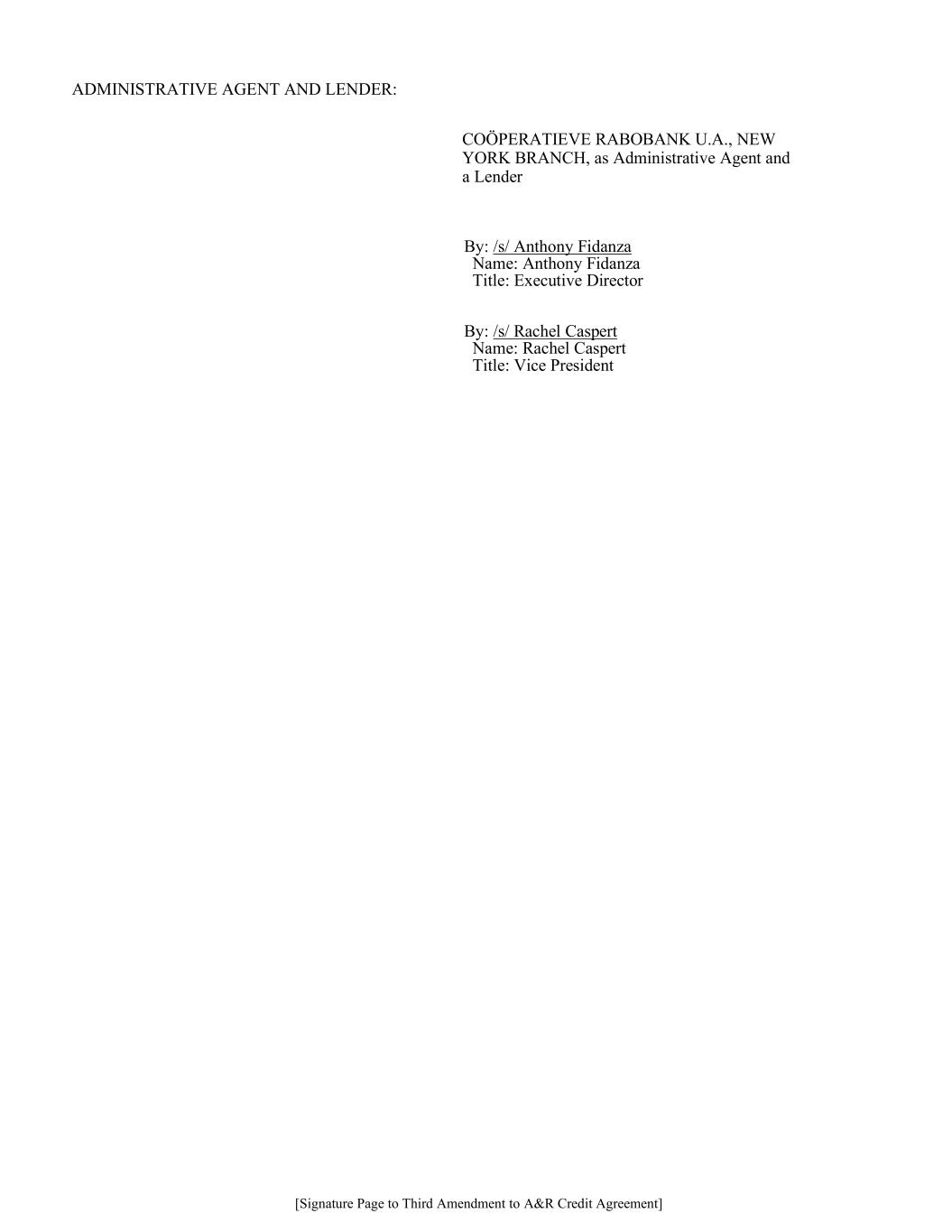 [ A & R信贷协议第三修正案签署页]行政代理人和贷款人:COO ö peratieve RABOBANK U.A.,New York Branch,作为行政代理人和贷款人:/s/Anthony Fidanza姓名:Anthony Fidanza职务:执行董事:/s/Rachel Caspert姓名:Rachel Caspert职务:副总裁