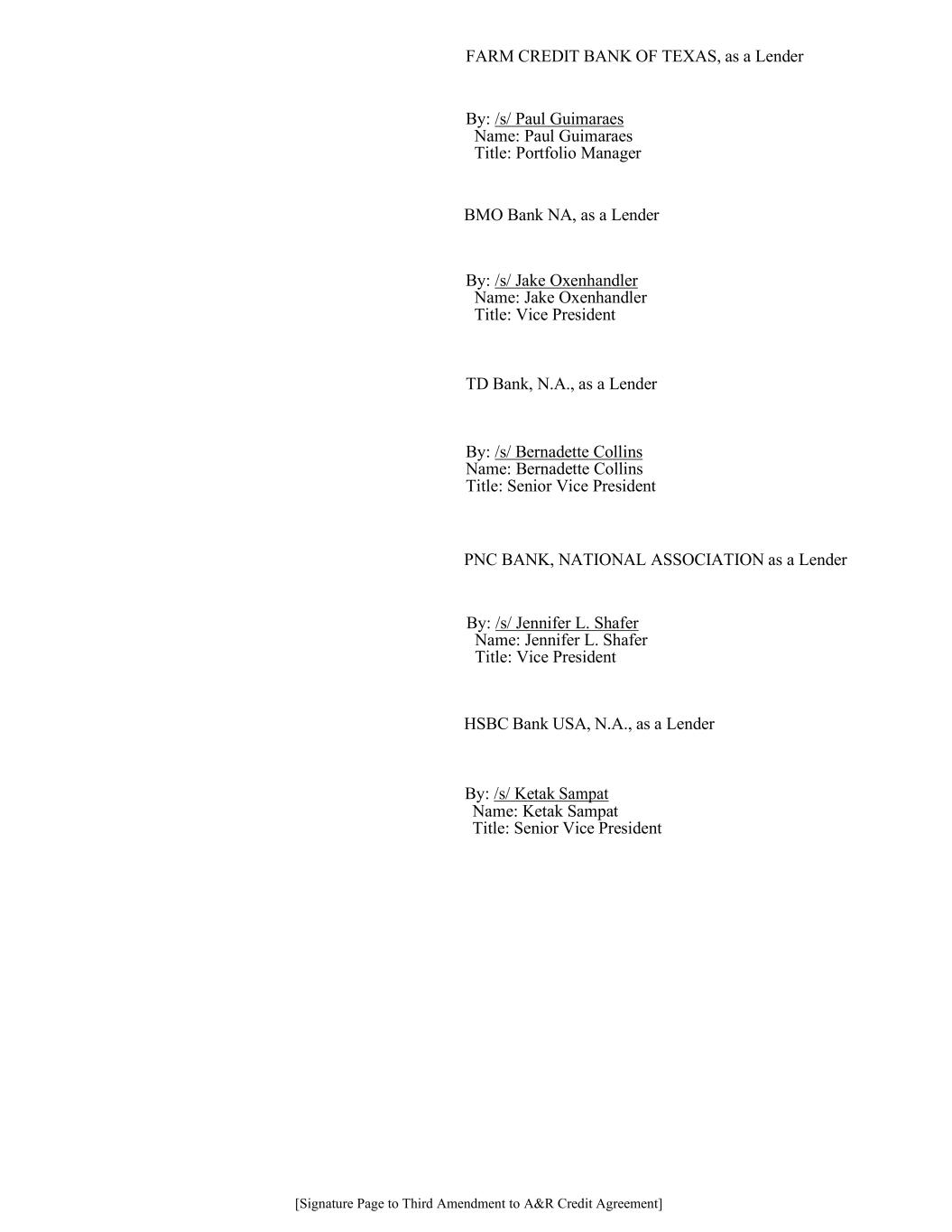 【A & R信贷协议第三修正案签署页】德克萨斯州农业信贷银行,作为贷款人:/s/Paul Guimaraes姓名:Paul Guimaraes职务:投资组合经理BMO银行NA,作为贷款人:/s/Jake Oxenhandler姓名:Jake Oxenhandler职务:副总裁TD Bank,N.A.,作为贷款人:/s/Bernadette Collins姓名:Bernadette Collins职务:高级副总裁PNC银行,作为贷款人全国协会由:/s/Jennifer L. Shafer姓名:Jennifer L. Shafer职务:副总裁HSBC Bank USA,N.A.,作为贷款人由:/s/Ketak Sampat姓名:Ketak Sampat职务:Senior Vice Vice President HSBC Bank USA,N.A. as a Lender by:/s/Ketak Sam