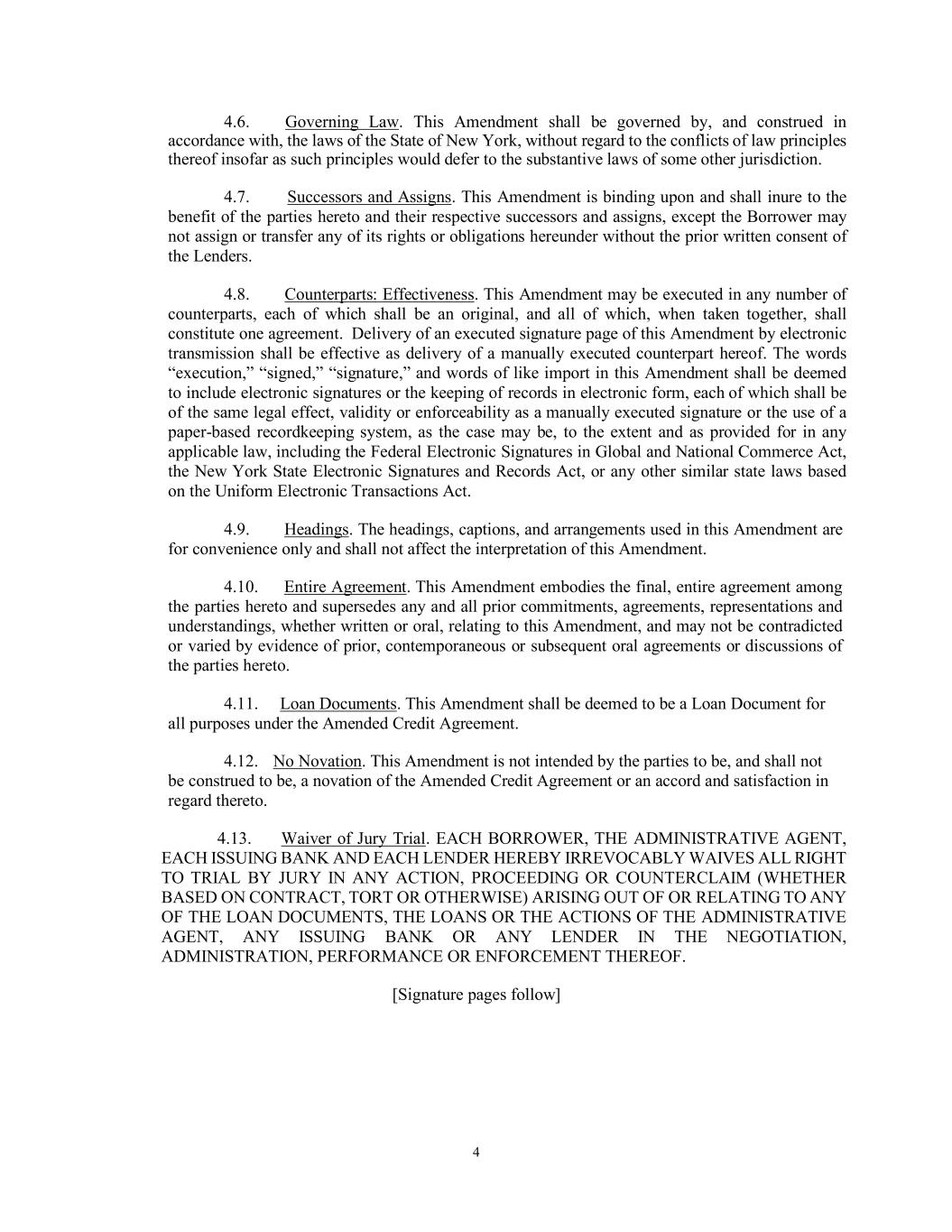 4 4.6.管辖法律。本修正案应受纽约州法律管辖并根据其解释,而不考虑其法律原则的冲突,只要这些原则将服从于某些其他司法管辖区的实体法。4.7.继任者和分配人。本修正案对协议各方及其各自的继承人和受让人具有约束力,并对其有利,但未经出借人事先书面同意,借款人不得转让或转让其在本协议项下的任何权利或义务。4.8.对口单位:有效性。本修正案可由任意数目的对应方执行,每一方应为正本,全部合并构成一份协议。以电子传输方式交付本修正案的已执行签字页,应具有交付本修正案手工执行对应方的效力。“执行”、“签名”、“签名”等字样和本修正案中具有相同重要性的词语应被视为包括电子签名或以电子形式保存记录,其中每一项均应在任何适用法律(包括《全球和国家商务联邦电子签名法》、《纽约州电子签名和记录法》或基于《统一电子交易法》的任何其他类似州法律的范围内并根据具体情况与手动执行的签名或使用纸质记录系统具有相同的法律效力、有效性或可执行性。4.9.标题。本修正案所使用的标题、标题、安排仅为方便起见,不影响本修正案的解释。4.10.全部协议。本修正案体现了双方之间的最终、完整协议,并取代了与本修正案有关的任何和所有先前的承诺、协议、陈述和谅解,无论是书面的还是口头的,并且不得因双方先前、同时或随后的口头协议或讨论的证据而相互矛盾或改变。4.11.贷款文件。本修订将被视为经修订信贷协议项下所有用途的贷款文件。4.12.没有新奇。各方无意且不应将本修订解释为经修订信贷协议的更新或与之相关的协议和满足。4.13.放弃陪审团审判。每个借款人、行政代理人、每个发行银行和每个贷款人在此不可撤销地放弃在任何诉讼、程序或反索赔(无论是基于合同、侵权或其他)中由任何贷款文件、贷款或行政代理人、任何发行银行或任何贷款人的行动产生或与之相关的所有由陪审团审判的权利,在谈判、行政、履行[签名页关注]