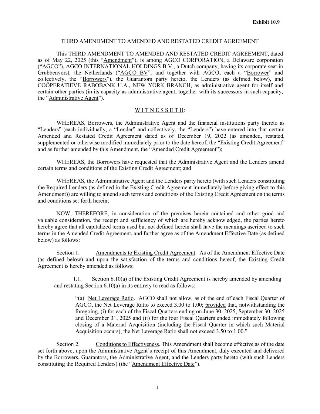 附件 10.91经修订和重述的信贷协议的第三次修订这份截至2025年5月22日经修订和重述的信贷协议的第三次修订(此“修订”),分别位于特拉华州公司AGCO(“TERM2”)的AGCO公司、公司所在地为荷兰Grubbenvorst的荷兰公司AGCO INTERNATIONAL HOLDINGS B.V.(“TERM0TERMBV”;与AGCO各为“借款人”,合称“借款人”)、本合同的担保方、LACCO TERM3 INTERNATIONAL HOLDINGS B.V。连同其继任者以这种身份,“行政代理人”)。W I T N E S E T H:鉴于借款人、行政代理人及其一方为“放款人”的金融机构(各自为“放款人”,统称为“放款人”)已于2022年12月19日订立若干经修订及重述的信贷协议(经修订、重述、补充或以其他方式于紧接本协议日期之前作出修订的“现有信贷协议”,以及经本修订进一步修订的“经修订信贷协议”);然而,借款人已要求行政代理人及贷款人修订现有信贷协议的若干条款及条件;而鉴于行政代理人及本协议的贷款方(该等贷款方构成规定的贷款方(定义见紧接本修订生效前的现有信贷协议))愿意根据本协议所载的条款及条件修订现有信贷协议的该等条款及条件;因此,现考虑到本协议所载的前提及其他良好及有价值的代价,兹确认该等代价的收取及充分性,双方在此同意,此处使用但未定义的所有大写术语应具有经修订的信贷协议中赋予此类术语的含义,并在修订生效日期(定义如下)进一步约定如下:第1节。对现有信贷协议的修订。自修订生效日期(定义见下文)起,在满足本协议的条款和条件后,现将现有信贷协议修订如下:1.1。现对现有信贷协议第6.10(a)节进行修订,将第6.10(a)节全文修订和重述如下:“(a)净杠杆率。截至AGCO的每个财政季度末,AGCO不得允许净杠杆率超过3.00至1.00;条件是,尽管有上述规定,(i)对于截至2025年6月30日、2025年9月30日和2025年12月31日的每个财政季度以及(ii)对于紧随重大收购结束后结束的四个财政季度(包括发生此类重大收购的财政季度),净杠杆率不得超过3.50至1.00。”第2节。生效条件。本修正案自行政代理人收到经借款人、担保人、行政代理人、贷款方(该等贷款人构成规定的贷款人)正式签署并交付的本修正案之日起(“修正案生效日”)生效。