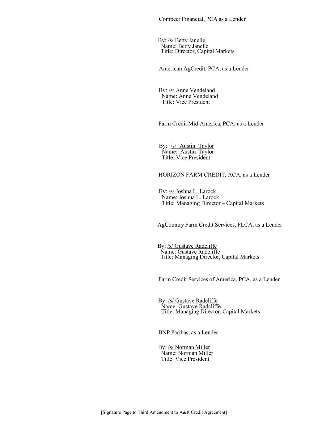 【A & R信贷协议第三修正案签署页】Compeer Financial,PCA作为贷方作者:/s/Betty Janelle姓名:Betty Janelle职务:资本市场总监American AgCredit,PCA,作为贷方作者:/s/Anne Vendeland姓名:Anne Vendeland职务:副总裁Farm Credit Mid-America,PCA,作为贷方作者:/s/Austin Taylor姓名:Austin Taylor职务:副总裁HORIZON Farm CREDIT,ACA,作为贷方作者:/s/Joshua L. Larock姓名:Joshua L. Larock职务:董事总经理– Capital Markets AgCountry Farm Credit Services,FLCA,作为贷方作者:/s/Gustave Radcliffe姓名:Gustave Radcliffe职务:董事总经理,Capital Markets Farm Credit Services of America,PCA,as a lender by:/s/Gustave Radcliffe姓名:Gustave Radcliffe职务:法国巴黎银行资本市场董事总经理,as a lender by:/s/Norman Miller姓名:Norman Miller职务:副总裁