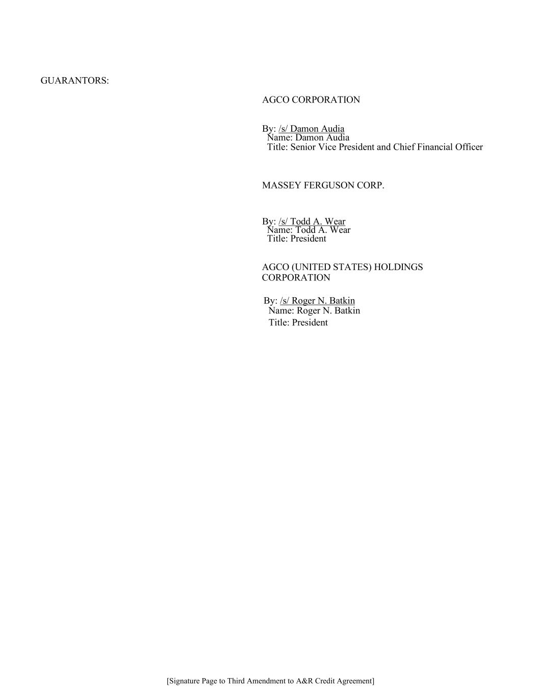 【A & R信贷协议第三次修订的签署页】作为证明,本协议各方已促使其各自的正式授权官员或代表自上述日期和年份开始执行并交付本修订。Borrowers:AGCO Corporation by:/s/Damon Audia Name:Damon Audia title:高级副总裁兼首席财务官AGCOTERM4 International HOLDINGS B.V. by:/s/Roger N. Batkin Name:Roger N. Batkin Title:Director by:/s/Maurice Geerkens Name:Maurice Geerkens Title:Director