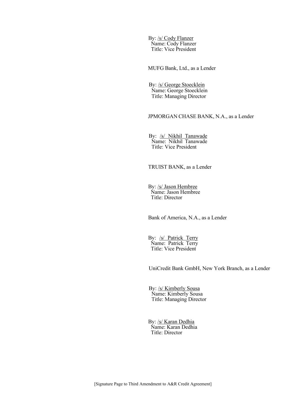 【A & R信贷协议第三修正案签署页】作者:/s/Cody Flanzer姓名:Cody Flanzer职务:副总裁MUFG银行股份有限公司,作为贷款人由:/s/George Stoecklein姓名:George Stoecklein职务:董事总经理JPMorgan CHASE BANK,N.A.,作为贷款人由:/s/Nikhil Tanawade姓名:Nikhil Tanawade职务:副总裁TRUIST BANK,作为贷款人由:/s/Jason Hembree姓名:Jason Hembree职务:Director Bank of America,N.A.,作为贷款人由:/s/Patrick Terry姓名:Patrick Terry职务:副总裁UniCredit Bank GmbH,New York Branch,作为贷款人:/s/Kimberly Sousa姓名:Kimberly Sousa职务:董事总经理:/s/Karan Dedhia姓名:Karan Dedhia职务:董事