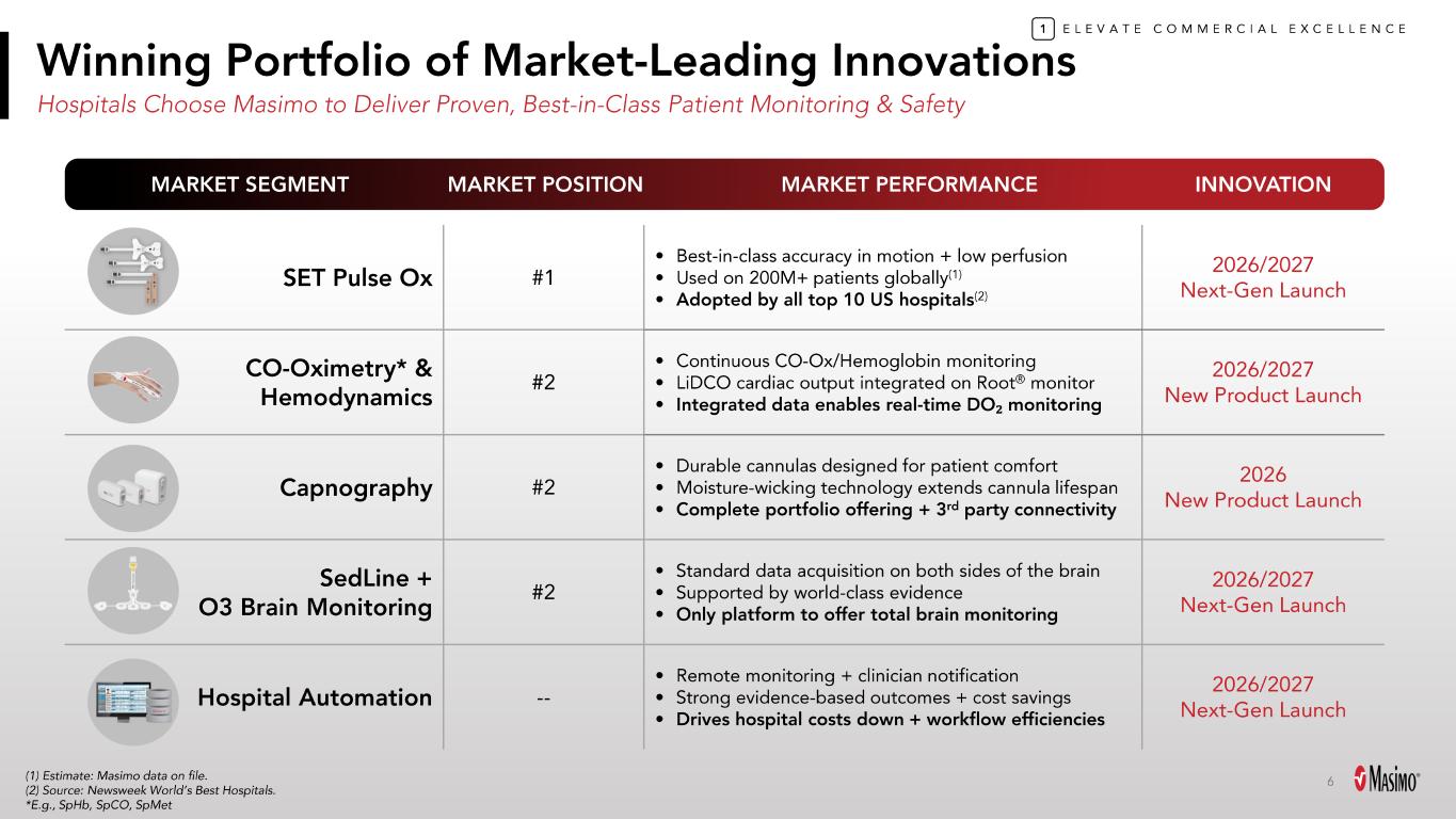 ELEVATE COMMERCIAL EXCELLENCE1 Set Pulse Ox # 1 •最佳运动精度+低灌注•全球200m +患者使用(1)•被所有美国前10大医院采用(2)2026/2027 Next-Gen Launch CO-血氧仪*&血流动力学# 2 •连续CO-OX/血红蛋白监测•根部集成的LiDCO心输出量®monitor •集成数据可实现实时DO↓监测2026/2027新产品上市二氧化碳图# 2 •设计的耐用插管为患者提供舒适度•吸湿排汗技术延长插管寿命•提供完整的产品组合+第三方连接2026新产品推出SedLine + O3脑监测# 2 •大脑两侧的标准数据采集•得到世界级证据的支持•提供全脑监测的唯一平台2026/2027 Next Gen推出医院自动化--•远程监测+临床医生通知•强大的循证结果+成本节约•推动医院成本下降+工作流程效率2026/2027 Next Gen推出赢得市场领先创新的产品组合-6家医院选择麦斯莫交付经过验证,Best-in-class patient monitoring & safety market segment Market position market performance innovation(1)Estimate:麦斯莫数据存档。(2)来源:《新闻周刊》世界最佳医院。*例如,SPHB、SPCO、SPMet