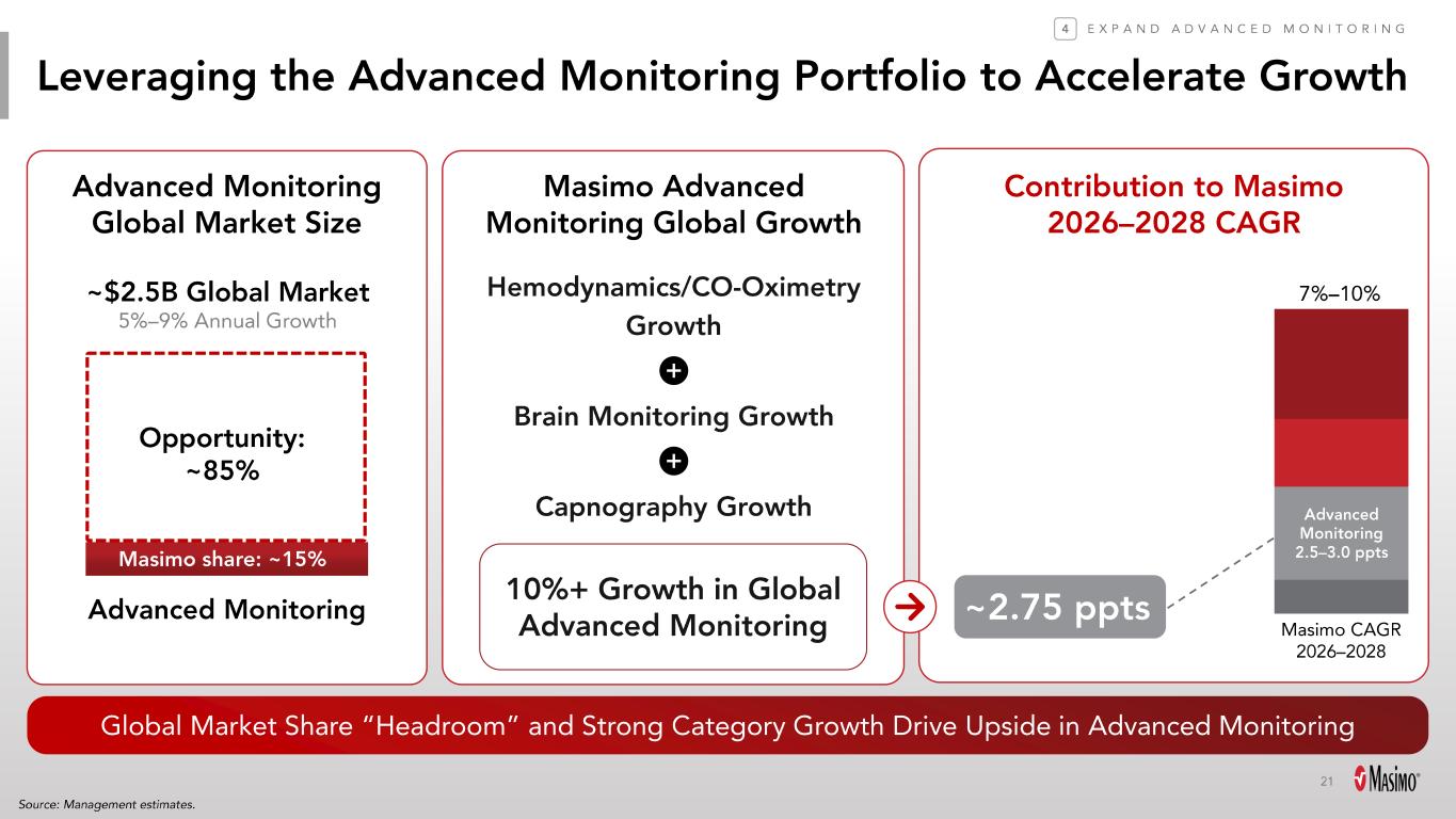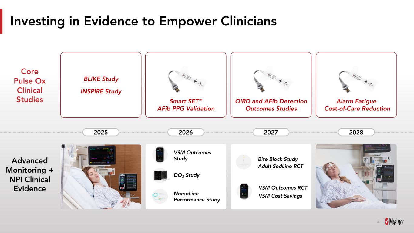 NPI高达1 ppt Ad vanced Monitoring 2.5 – 3.0 ppts INT’l Pulse OX 1.75 – 2.25 ppts US Pulse OX 2.75 – 3.75 ppts 3注:收入增长,不包括2025年第53个销售周的影响。麦斯莫增长支柱7% – 10% 麦斯莫 CAGR2026 – 2028 Elevate Commercial Excellence Proven Markets | Proven Technology | Proven Execution1 Elevate Commercial Excellence Proven Markets | Proven Technology | Proven Execution2 Accelerate US Pulse OX Growth Accelerate US Pulse OX Growth 3 Increase International Pulse OX Market Share Expand Advanced Monitoring 45 Execute New Product Launch
