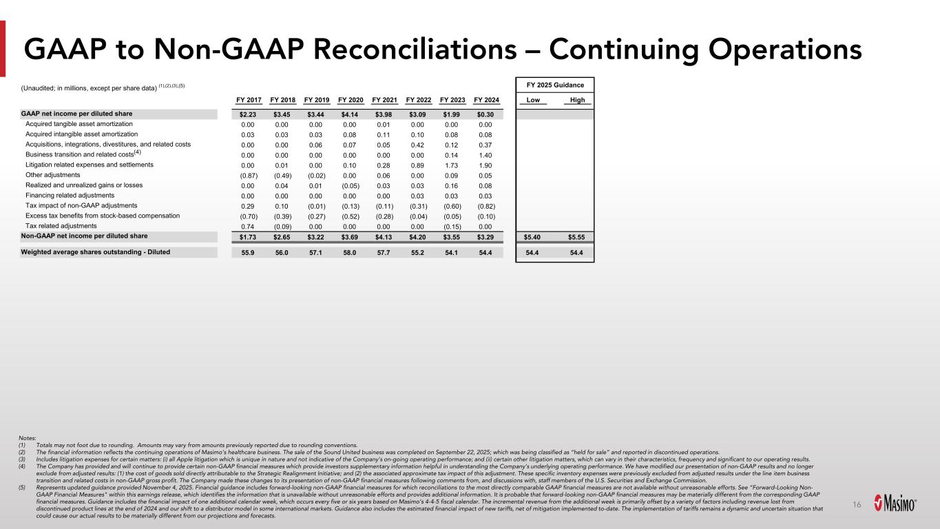 GAAP与Non-GAAP对账–持续经营注意事项:(1)由于四舍五入,总数可能不够。由于四舍五入的惯例,金额可能与先前报告的金额有所不同。(二)财务信息反映麦斯莫医疗健康业务的持续经营情况。出售Sound United业务已于2025年9月22日完成;该业务被归类为“持作出售”并在已终止经营业务中报告。(3)包括某些事项的诉讼费用:(i)所有性质独特且不代表公司持续经营业绩的Apple诉讼;以及(ii)某些其他诉讼事项,其特点、频率和对我们的经营业绩可能有所不同。(4)公司已提供并将继续提供某些非公认会计准则财务指标,这些指标为投资者提供了有助于了解公司基本经营业绩的补充信息。我们修改了我们对非公认会计原则结果的表述,不再从调整后的结果中排除:(1)直接归属于战略调整倡议的销售商品成本;(2)这一调整的相关近似税收影响。这些特定的库存费用此前被排除在非美国通用会计准则毛利润的细目业务过渡和相关成本下的调整结果之外。在美国证券交易委员会工作人员发表评论并与其进行讨论后,该公司对非GAAP财务指标的表述方式进行了这些更改。(5)代表2025年11月4日提供的更新指南。财务指导包括前瞻性的非GAAP财务指标,如果不做出不合理的努力,就无法获得与最直接可比的GAAP财务指标的对账。请参阅本财报中的“前瞻性非GAAP财务指标”,该指标确定了未经不合理努力无法获得的信息,并提供了额外信息。前瞻性的非GAAP财务指标很可能与相应的GAAP财务指标存在重大差异。该指南包括额外一个日历周的财务影响,该影响根据麦斯莫的4-4-5财政日历每五年或六年发生一次。额外一周带来的增量收入主要被多种因素所抵消,包括2024年底停产产品线带来的收入损失,以及我们在一些国际市场转向分销商模式。指导意见还包括新关税的估计财务影响,扣除迄今为止实施的缓解措施。关税的实施仍然是一个动态和不确定的情况,可能导致我们的实际结果与我们的预测和预测存在重大差异。(4)(未经审计;以百万计,每股数据除外)(1)、(2)、(3)2025财年指导2017财年2018财年2019财年2020财年2021财年2022财年2023财年2024低高GAAP每股摊薄净收益2.23美元3.45美元3.44美元4.14美元3.98美元3.09美元1.99美元0.30美元收购有形资产摊销0.00 0.00 0.00 0.00 0.00 0.01 0.00 0.00 0.00收购无形资产摊销0.03 0.03 0.03 0.08 0.1 10.08 0.10 0.08 0.08收购、整合、资产剥离,及相关成本0.00 0.00 0.06 0.07 0.05 0.42 0.12 0.37业务过渡及相关成本0.00 0.00 0.00 0.00 0.00 0.00 0.14 1.40诉讼相关费用及结算0.00 0.01 0.00 0.10 0.28 0.89 1.73 1.90其他调整(0.87)(0.49)(0.02)0.00 0.06 0.00 0.09 0.05已实现和未实现损益0.00 0.04 0.01(0.05)0.03 0.03 0.16 0.08融资相关调整0.00 0.00 0.00 0.00 0.00 0.03 0.03 0.03非公认会计原则调整的税收影响0.29 0.10(0.01)(0.13)(0.11)(0.31)(0.60)(0.82)股票薪酬的超额税收优惠(0.70)(0.39)(0.27)(0.52)(0.28)(0.04)(0.05)(0.10)税收相关调整0.74(0.09)0.00 0.00 0.00(0.15)0.00非公认会计原则每股摊薄净收益$ 1.73 $ 2.65 $ 3.22 $ 3.69 $ 4.13 $ 4.20 $ 3.55 $ 3.29 $ 5.40 $ 5.55加权平均流通股-稀释55.9 56.05 7.15 8.05 7.75 5.25 4.15 4.45 4.45 4.4,(5)16