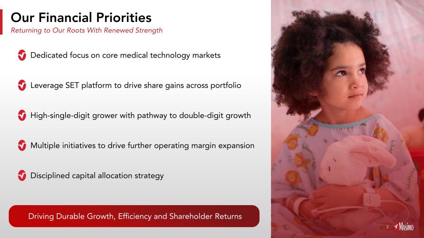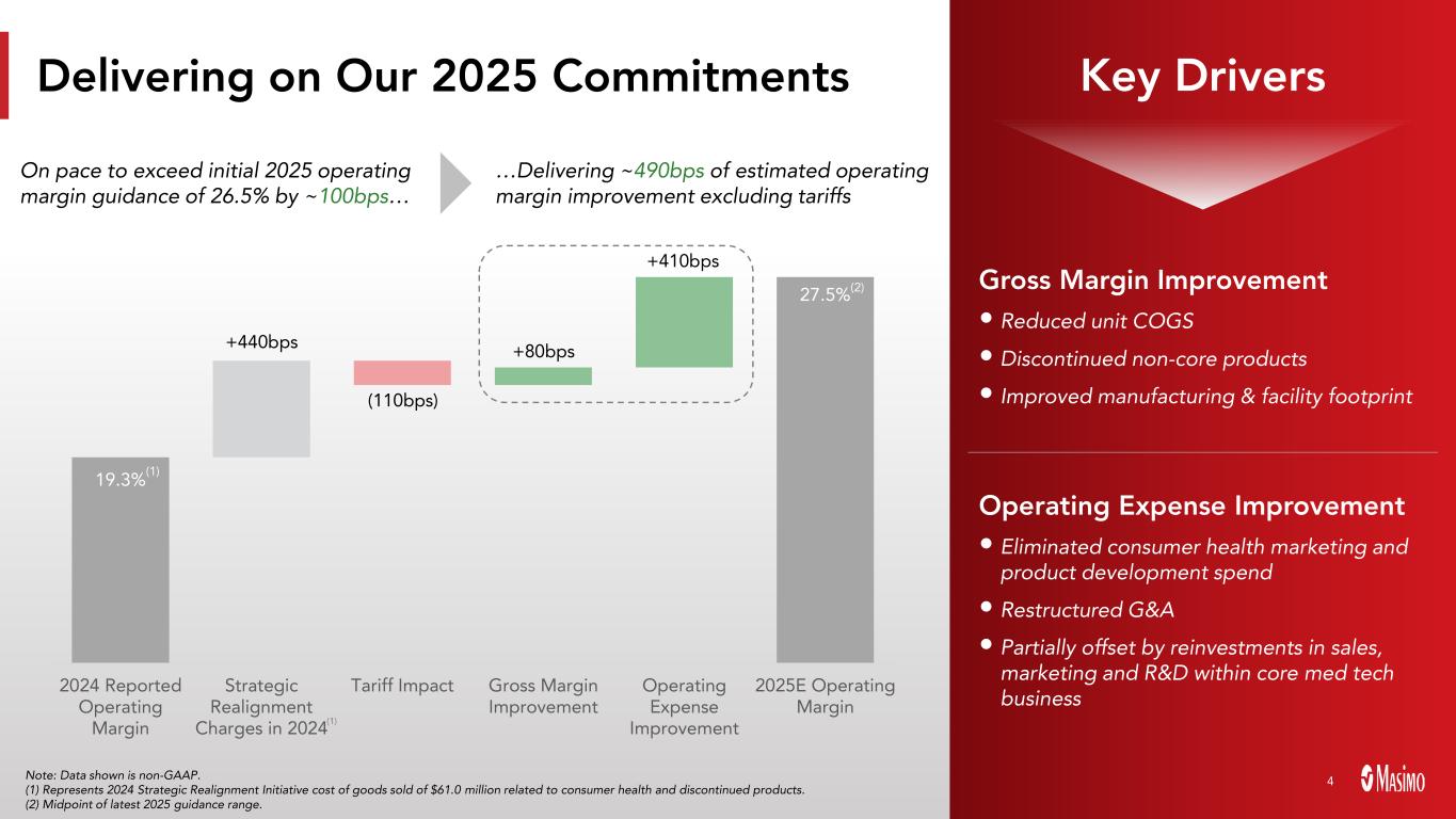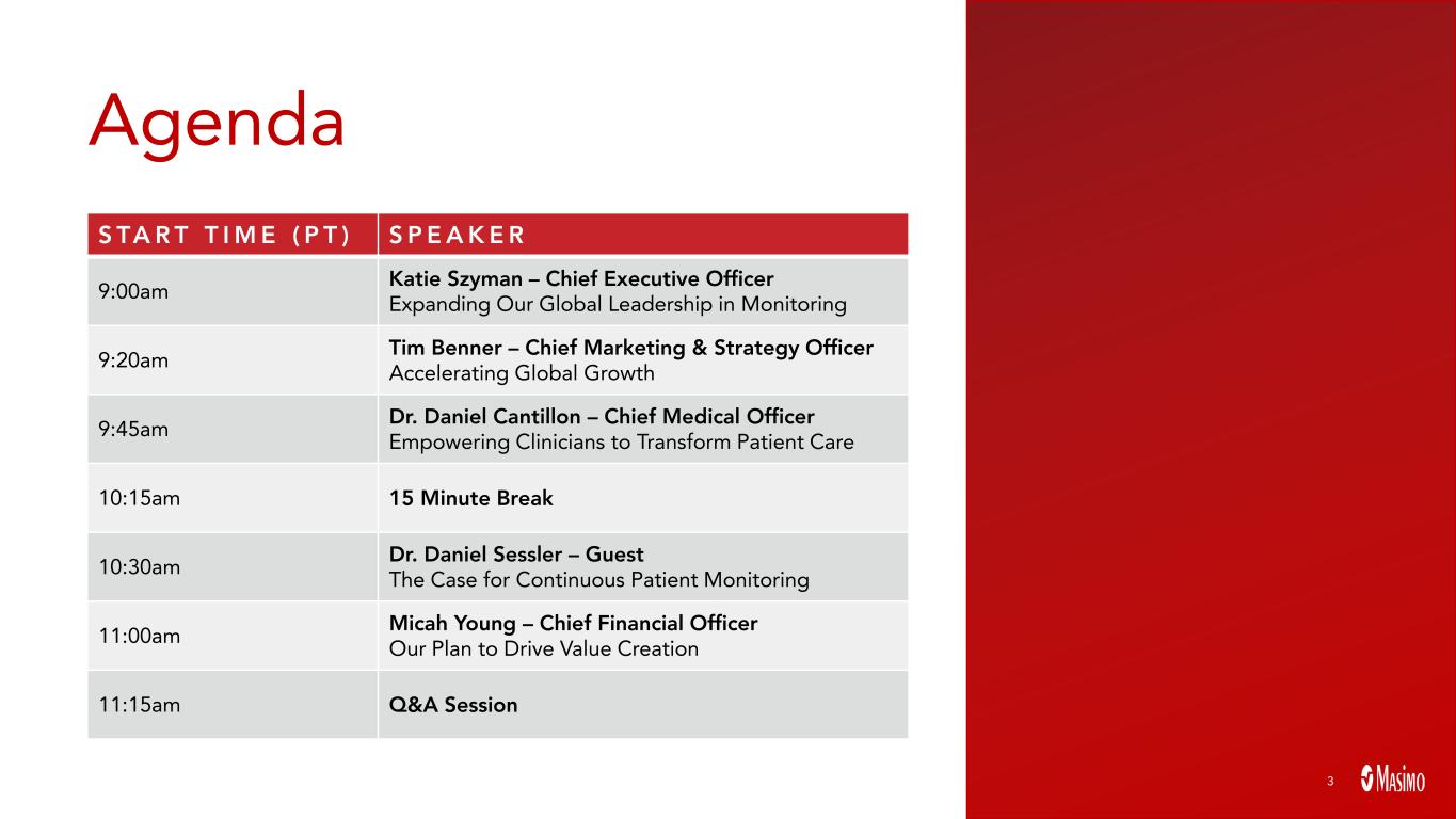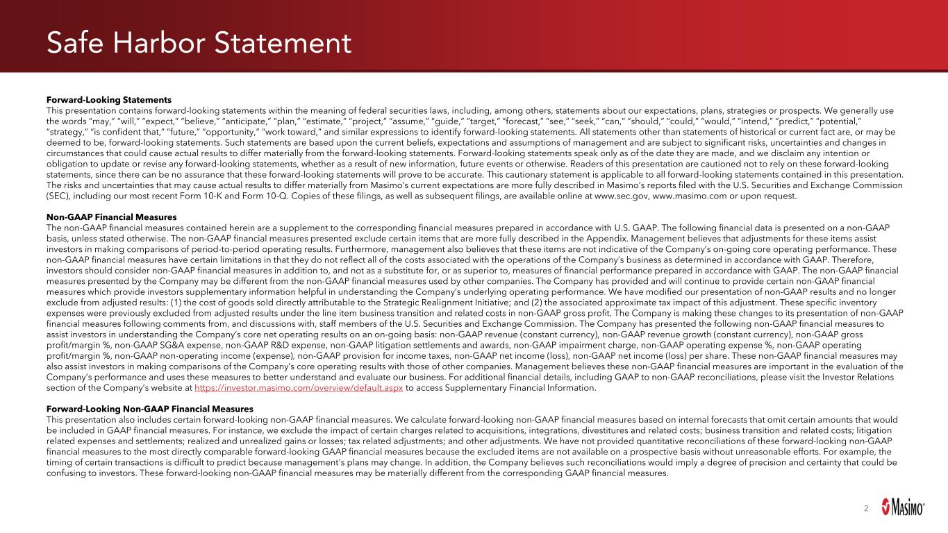 安全港声明前瞻性声明本演示文稿包含联邦证券法含义内的前瞻性声明,除其他外,包括关于我们的期望、计划、战略或前景的声明。我们通常使用“可能”、“将”、“预期”、“相信”、“预期”、“计划”、“估计”、“项目”、“假设”、“指导”、“目标”、“预测”、“看到”、“寻求”、“可以”、“应该”、“可以”、“将”、“打算”、“预测”、“潜力”、“战略”、“有信心”、“未来”、“机会”、“努力”等类似表述来识别前瞻性陈述。除历史或当前事实陈述之外的所有陈述都是或可能被视为前瞻性陈述。此类陈述基于管理层当前的信念、期望和假设,并受到可能导致实际结果与前瞻性陈述产生重大差异的重大风险、不确定性和环境变化的影响。前瞻性陈述仅在作出之日起生效,我们不承担任何更新或修改任何前瞻性陈述的意图或义务,无论是由于新信息、未来事件或其他原因。告诫本演示文稿的读者不要依赖这些前瞻性陈述,因为无法保证这些前瞻性陈述将被证明是准确的。本警示性声明适用于本演示文稿中包含的所有前瞻性声明。可能导致实际结果与麦斯莫当前预期存在重大差异的风险和不确定性在麦斯莫向美国证券交易委员会(SEC)提交的报告中有更全面的描述,包括我们最近的10-K表格和10-Q表格。这些文件的副本以及随后提交的文件,可在www.sec.gov、www.masimo.com在线查阅或根据要求查阅。非GAAP财务指标此处包含的非GAAP财务指标是对根据美国GAAP编制的相应财务指标的补充。除非另有说明,以下财务数据均按非公认会计原则列报。所提供的非GAAP财务指标不包括附录中更全面描述的某些项目。管理层认为,对这些项目的调整有助于投资者对不同时期的经营业绩进行比较。此外,管理层还认为,这些项目并不代表公司持续的核心经营业绩。这些非GAAP财务指标有一定的局限性,因为它们没有反映根据GAAP确定的与公司业务运营相关的所有成本。因此,投资者应考虑将非GAAP财务指标作为根据GAAP编制的财务业绩指标的补充,而不是替代或优于这些指标。公司提出的非美国通用会计准则财务指标可能与其他公司采用的非美国通用会计准则财务指标不同。公司已提供并将继续提供某些非公认会计准则财务指标,为投资者提供有助于了解公司基本经营业绩的补充信息。我们修改了我们对非公认会计原则结果的表述,不再从调整后的结果中排除:(1)直接归属于战略调整倡议的销售商品成本;(2)这一调整的相关近似税收影响。这些特定的库存费用此前被排除在非美国通用会计准则毛利润中的细目业务过渡和相关成本下的调整结果之外。根据美国证券交易委员会工作人员的评论和讨论,该公司正在对其非GAAP财务指标的表述方式进行这些更改。公司提出以下非美国通用会计准则财务指标,以帮助投资者持续了解公司的核心净经营业绩:非美国通用会计准则收入(固定货币)、非美国通用会计准则收入增长(固定货币)、非美国通用会计准则毛利率/利润率%、非美国通用会计准则SG & A费用、非美国通用会计准则研发费用、非美国通用会计准则诉讼和解和裁决、非美国通用会计准则减值费用、非美国通用会计准则营业费用%、非美国通用会计准则营业利润/利润率%、非美国通用会计准则营业外收入(费用)、非美国通用会计准则所得税拨备、非美国通用会计准则净收益(亏损)、非美国通用会计准则每股净收益(亏损)。这些非公认会计准则财务指标也可能有助于投资者将公司的核心经营业绩与其他公司的业绩进行比较。管理层认为,这些非公认会计准则财务指标在评估公司业绩方面很重要,并使用这些指标来更好地理解和评估我们的业务。有关更多财务细节,包括GAAP与非GAAP对账, 请访问公司网站投资者关系部分,网址为https://investor.masimo.com/overview/default.aspx,以获取补充财务信息。前瞻性非GAAP财务指标本演示文稿还包括某些前瞻性非GAAP财务指标。我们根据内部预测计算前瞻性非GAAP财务指标,其中省略了将包含在GAAP财务指标中的某些金额。例如,我们排除了与收购、整合、剥离和相关成本相关的某些费用的影响;业务过渡和相关成本;与诉讼相关的费用和和解;已实现和未实现的收益或损失;与税收相关的调整;以及其他调整。我们没有提供这些前瞻性非GAAP财务指标与最直接可比的前瞻性GAAP财务指标的量化对账,因为如果没有不合理的努力,排除的项目就无法在预期的基础上获得。例如,某些交易的时间很难预测,因为管理层的计划可能会发生变化。此外,该公司认为,这种对账将意味着一定程度的精确度和确定性,这可能会让投资者感到困惑。这些前瞻性的非GAAP财务指标可能与相应的GAAP财务指标存在重大差异。2