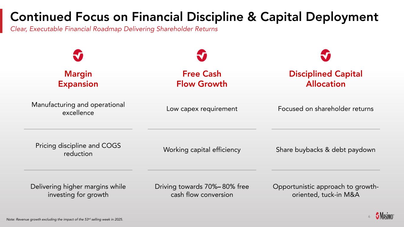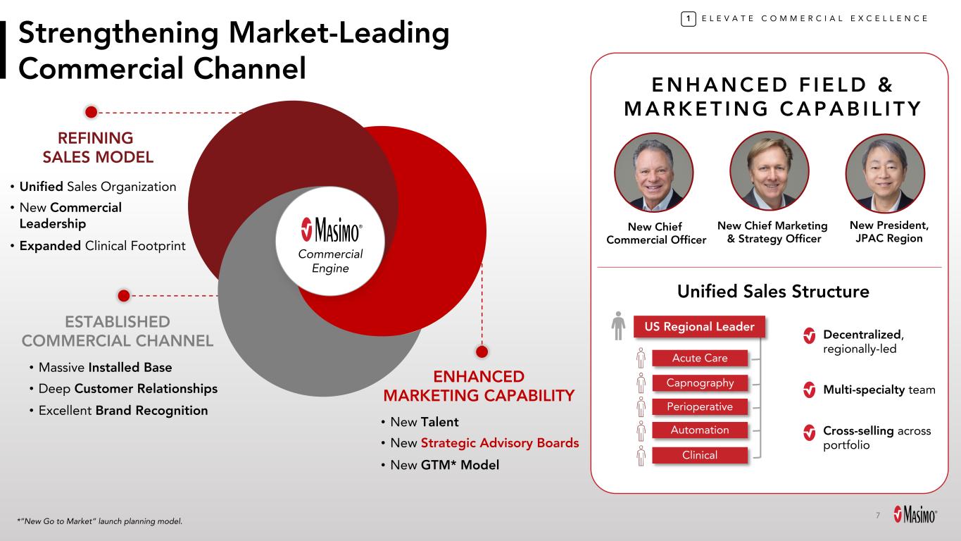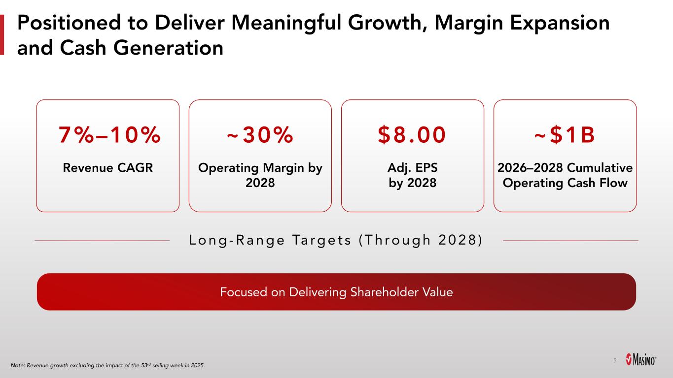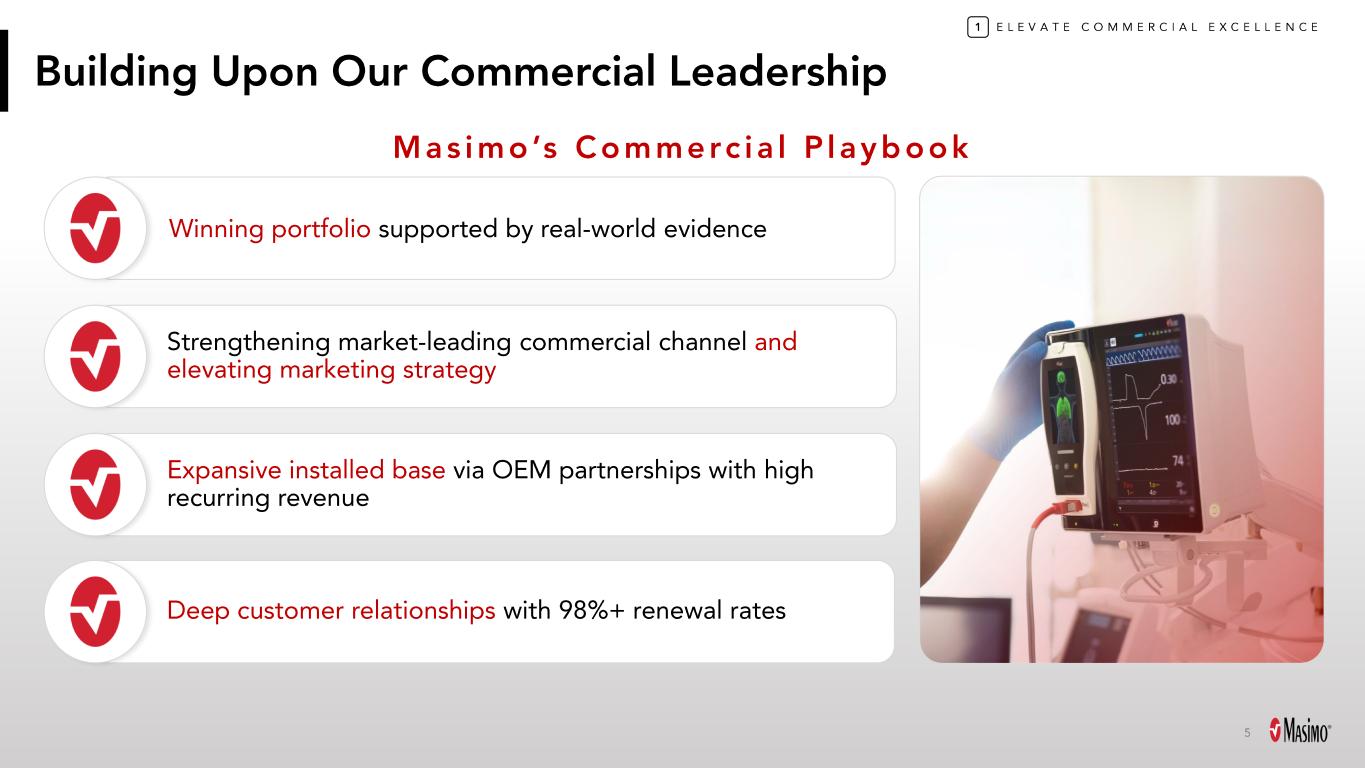 安全港声明前瞻性声明本演示文稿包含联邦证券法含义内的前瞻性声明,除其他外,包括关于我们的期望、计划、战略或前景的声明。我们通常使用“可能”、“将”、“预期”、“相信”、“预期”、“计划”、“估计”、“项目”、“假设”、“指导”、“目标”、“预测”、“看到”、“寻求”、“可以”、“应该”、“可以”、“将”、“打算”、“预测”、“潜力”、“战略”、“有信心”、“未来”、“机会”、“努力”等类似表述来识别前瞻性陈述。除历史或当前事实陈述之外的所有陈述都是或可能被视为前瞻性陈述。此类陈述基于管理层当前的信念、期望和假设,并受到可能导致实际结果与前瞻性陈述产生重大差异的重大风险、不确定性和环境变化的影响。前瞻性陈述仅在作出之日起生效,我们不承担任何更新或修改任何前瞻性陈述的意图或义务,无论是由于新信息、未来事件或其他原因。告诫本演示文稿的读者不要依赖这些前瞻性陈述,因为无法保证这些前瞻性陈述将被证明是准确的。本警示性声明适用于本演示文稿中包含的所有前瞻性声明。可能导致实际结果与麦斯莫当前预期存在重大差异的风险和不确定性在麦斯莫向美国证券交易委员会(SEC)提交的报告中有更全面的描述,包括我们最近的10-K表格和10-Q表格。这些文件的副本以及随后提交的文件,可在www.sec.gov、www.masimo.com在线查阅或根据要求查阅。非GAAP财务指标此处包含的非GAAP财务指标是对根据美国GAAP编制的相应财务指标的补充。除非另有说明,以下财务数据均按非公认会计原则列报。所提供的非GAAP财务指标不包括附录中更全面描述的某些项目。管理层认为,对这些项目的调整有助于投资者对不同时期的经营业绩进行比较。此外,管理层还认为,这些项目并不代表公司持续的核心经营业绩。这些非GAAP财务指标有一定的局限性,因为它们没有反映根据GAAP确定的与公司业务运营相关的所有成本。因此,投资者应考虑将非GAAP财务指标作为根据GAAP编制的财务业绩指标的补充,而不是替代或优于这些指标。公司提出的非美国通用会计准则财务指标可能与其他公司采用的非美国通用会计准则财务指标不同。公司已提供并将继续提供某些非公认会计准则财务指标,为投资者提供有助于了解公司基本经营业绩的补充信息。我们修改了我们对非公认会计原则结果的表述,不再从调整后的结果中排除:(1)直接归属于战略调整倡议的销售商品成本;(2)这一调整的相关近似税收影响。这些特定的库存费用此前被排除在非美国通用会计准则毛利润中的细目业务过渡和相关成本下的调整结果之外。根据美国证券交易委员会工作人员的评论和讨论,该公司正在对其非GAAP财务指标的表述方式进行这些更改。公司提出以下非美国通用会计准则财务指标,以帮助投资者持续了解公司的核心净经营业绩:非美国通用会计准则收入(固定货币)、非美国通用会计准则收入增长(固定货币)、非美国通用会计准则毛利率/利润率%、非美国通用会计准则SG & A费用、非美国通用会计准则研发费用、非美国通用会计准则诉讼和解和裁决、非美国通用会计准则减值费用、非美国通用会计准则营业费用%、非美国通用会计准则营业利润/利润率%、非美国通用会计准则营业外收入(费用)、非美国通用会计准则所得税拨备、非美国通用会计准则净收益(亏损)、非美国通用会计准则每股净收益(亏损)。这些非公认会计准则财务指标也可能有助于投资者将公司的核心经营业绩与其他公司的业绩进行比较。管理层认为,这些非公认会计准则财务指标在评估公司业绩方面很重要,并使用这些指标来更好地理解和评估我们的业务。有关更多财务细节,包括GAAP与非GAAP对账, 请访问公司网站投资者关系部分,网址为https://investor.masimo.com/overview/default.aspx,以获取补充财务信息。前瞻性非GAAP财务指标本演示文稿还包括某些前瞻性非GAAP财务指标。我们根据内部预测计算前瞻性非GAAP财务指标,其中省略了将包含在GAAP财务指标中的某些金额。例如,我们排除了与收购、整合、剥离和相关成本相关的某些费用的影响;业务过渡和相关成本;与诉讼相关的费用和和解;已实现和未实现的收益或损失;与税收相关的调整;以及其他调整。我们没有提供这些前瞻性非GAAP财务指标与最直接可比的前瞻性GAAP财务指标的量化对账,因为如果没有不合理的努力,排除的项目就无法在预期的基础上获得。例如,某些交易的时间很难预测,因为管理层的计划可能会发生变化。此外,该公司认为,这种对账将意味着一定程度的精确度和确定性,这可能会让投资者感到困惑。这些前瞻性的非GAAP财务指标可能与相应的GAAP财务指标存在重大差异。2