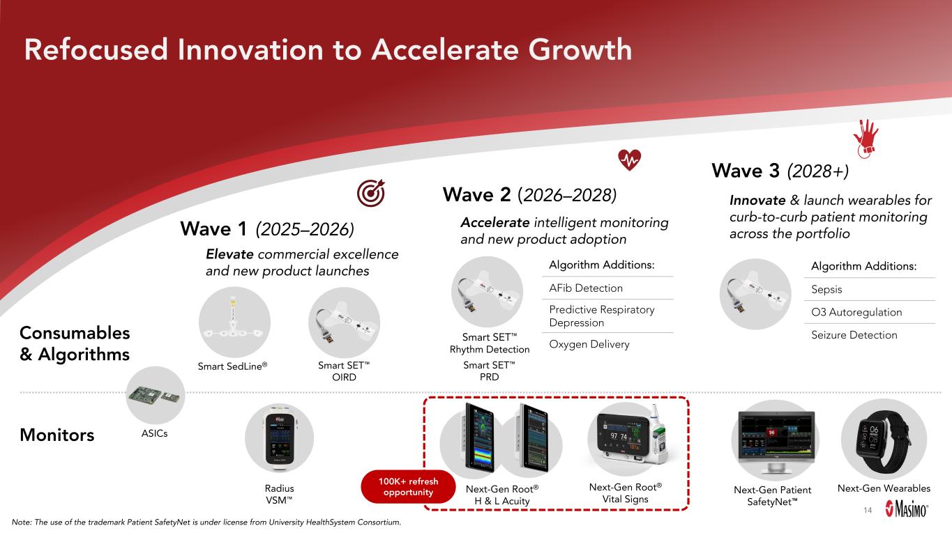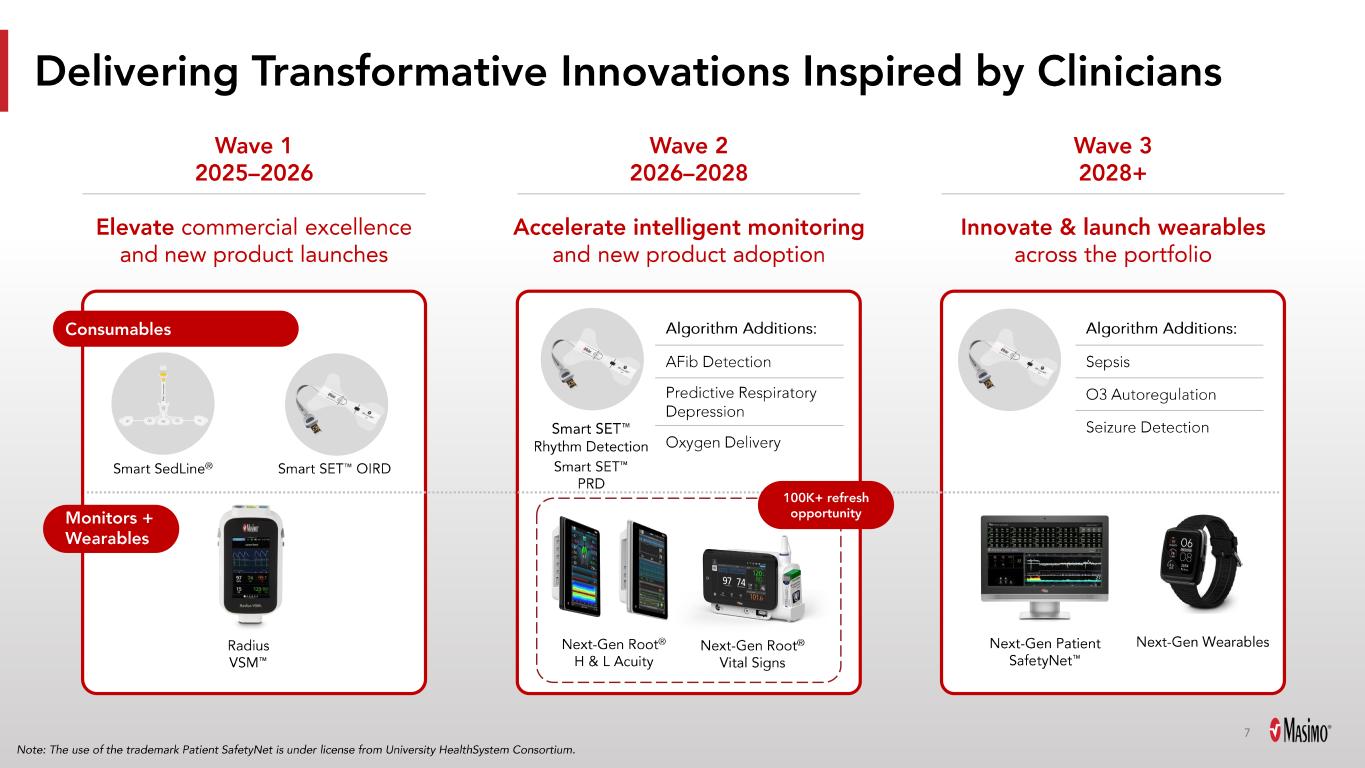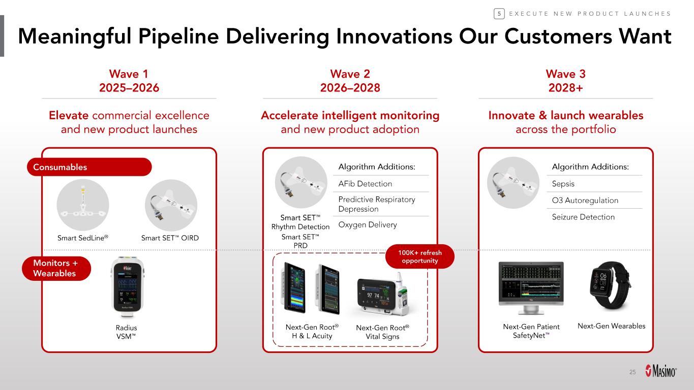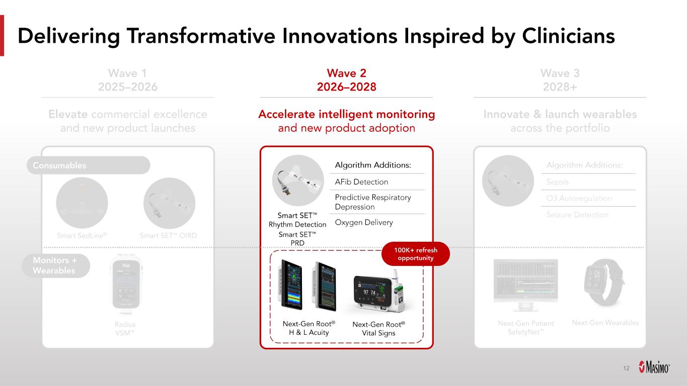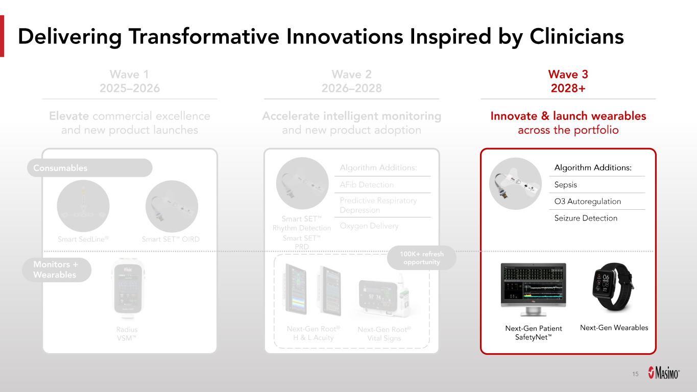 交付受临床医生启发的变革性创新Next Gen Root®H & L Acuity Next Gen Root®生命体征加速智能监测和新产品采用Wave 2 2026 – 2028算法新增:AFIB检测预测性呼吸抑制氧气输送智能SET节奏检测智能SET PRD 15 Next Gen Patient Safetynet算法新增:Sepsis O3自动调节癫痫检测下一代可穿戴设备创新并在整个产品组合中推出可穿戴设备Wave 3 2028 + Radius VSM耗材提升商业卓越性,新产品推出Wave 1 2025 – 2026显示器+可穿戴设备Smart SedLine®Smart Set OIRD 100K +刷新机会