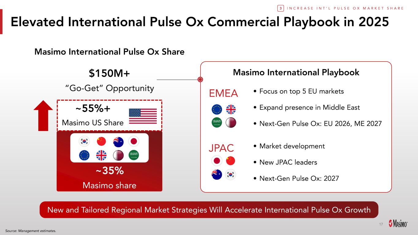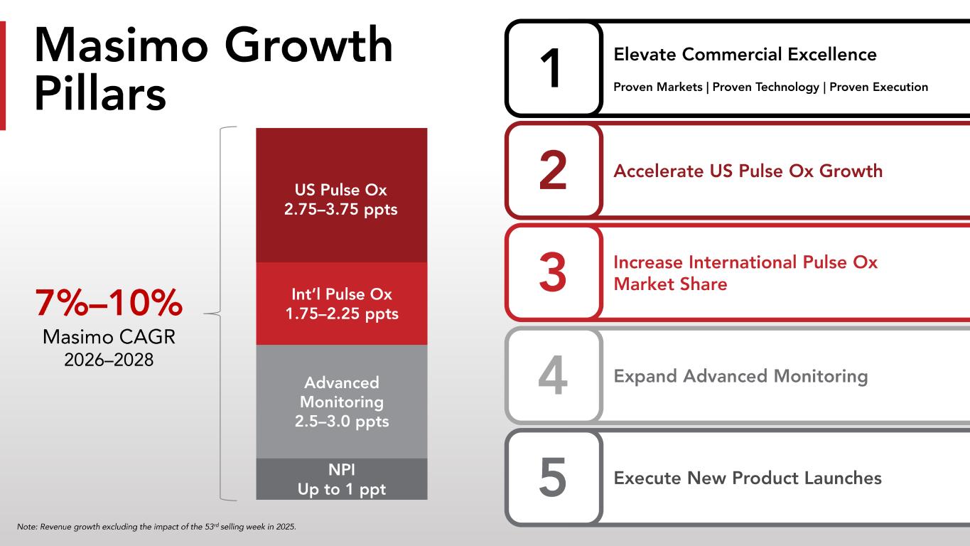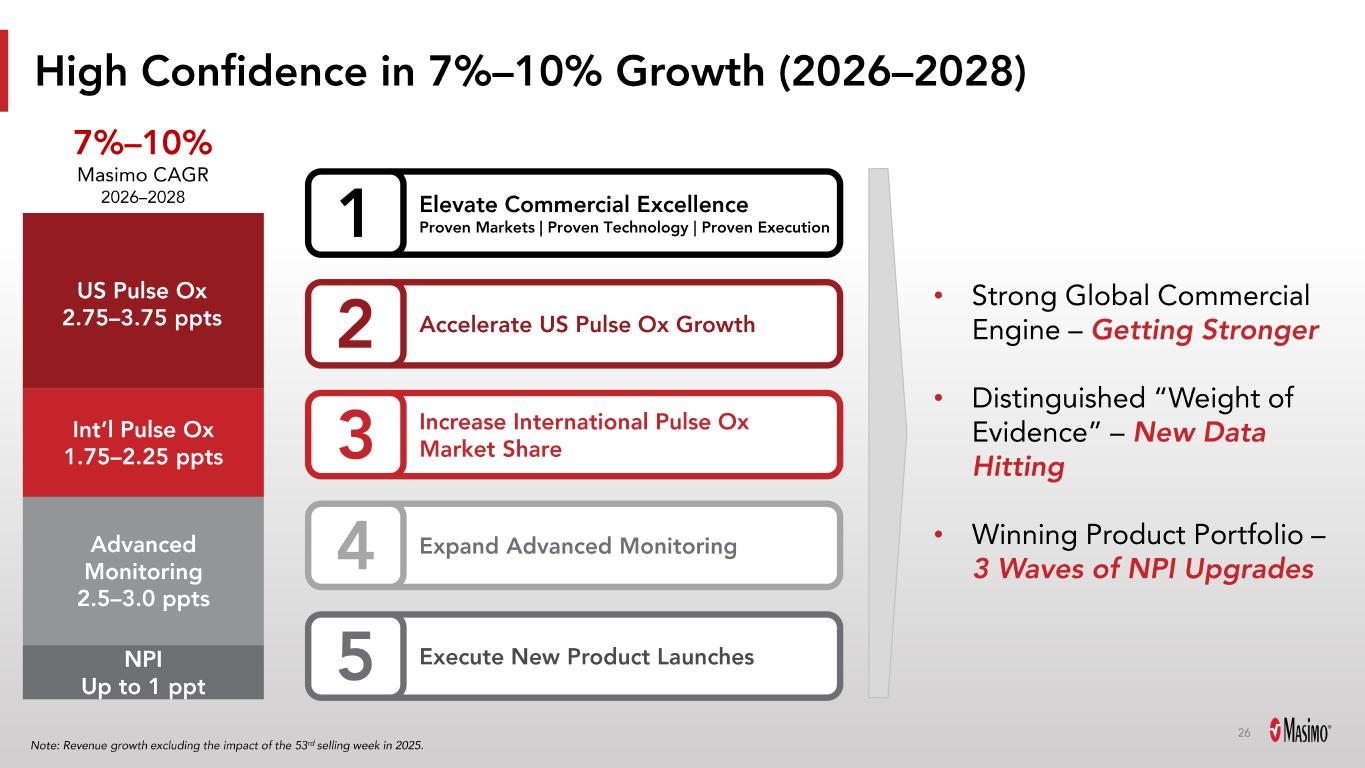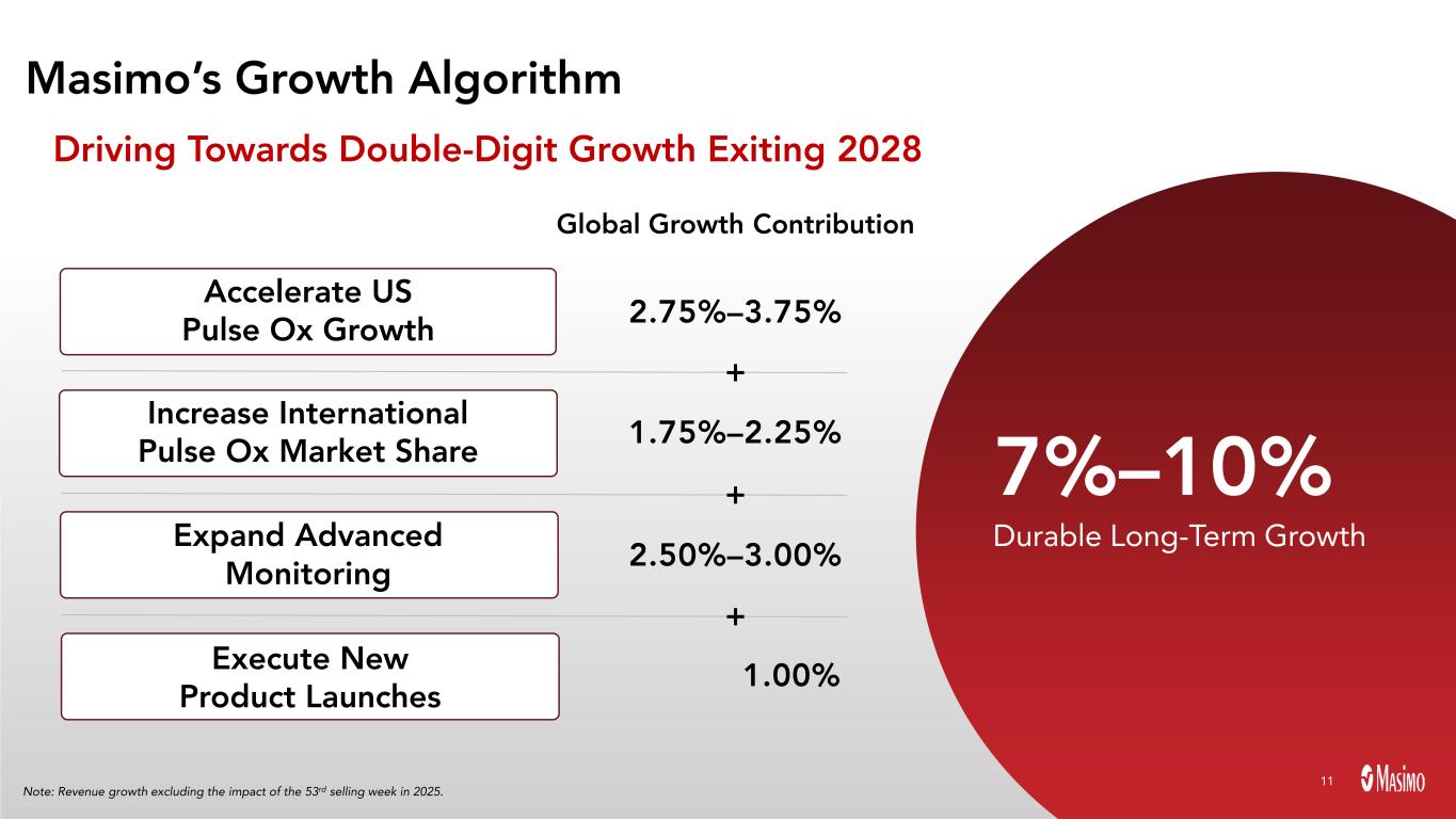 注:收入增长,不包括2025年第53个销售周的影响。扩展高级监测2.50% – 3.00% 7% – 10%持久的长期增长麦斯莫的增长算法推动实现两位数增长退出2028年加速美国脉冲OX增长2.75% – 3.75%执行新产品推出全球增长贡献渗透国际脉冲OX市场1.75% – 2.25%提高国际脉冲OX市场份额+++ 1.00% 11