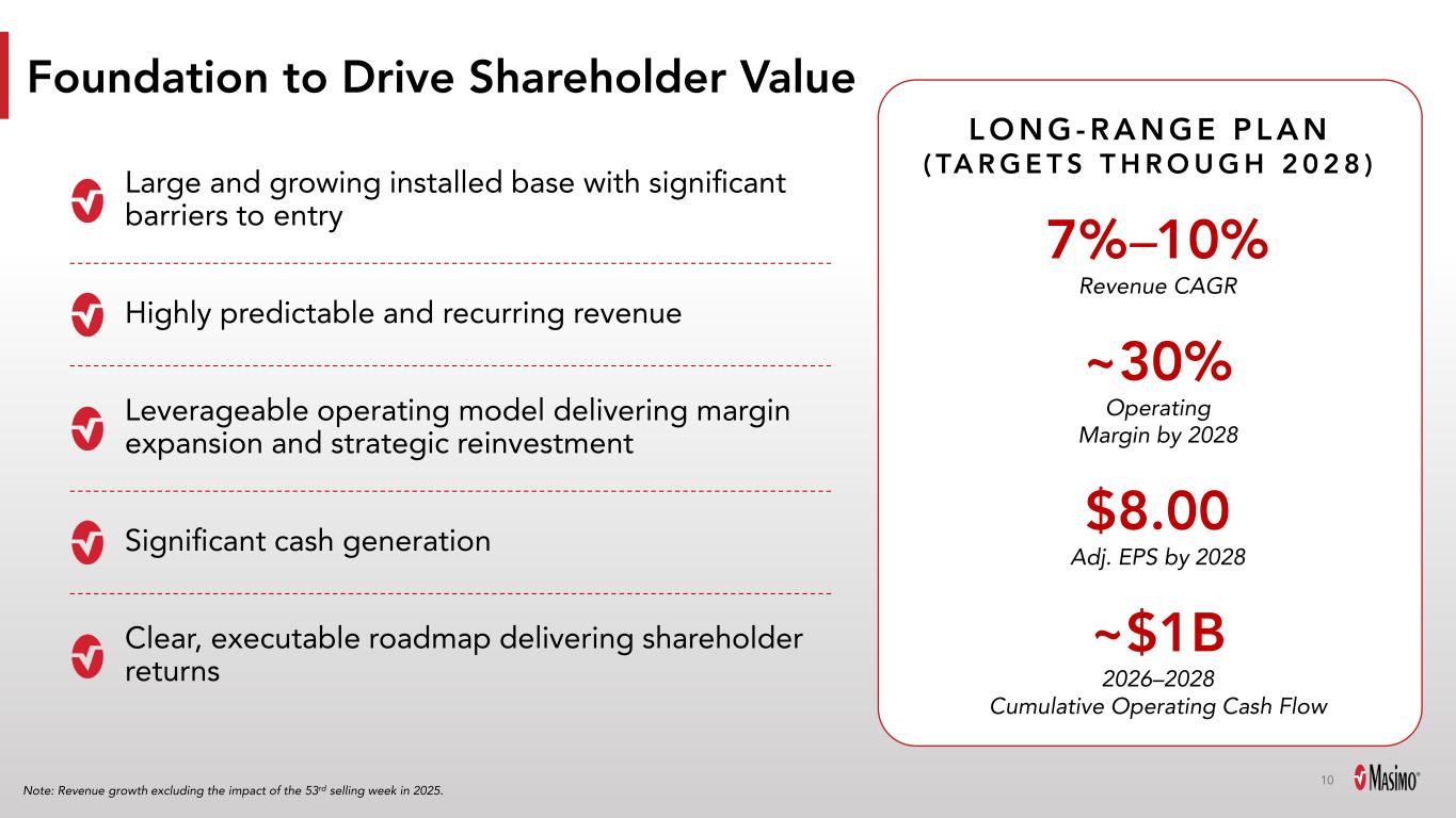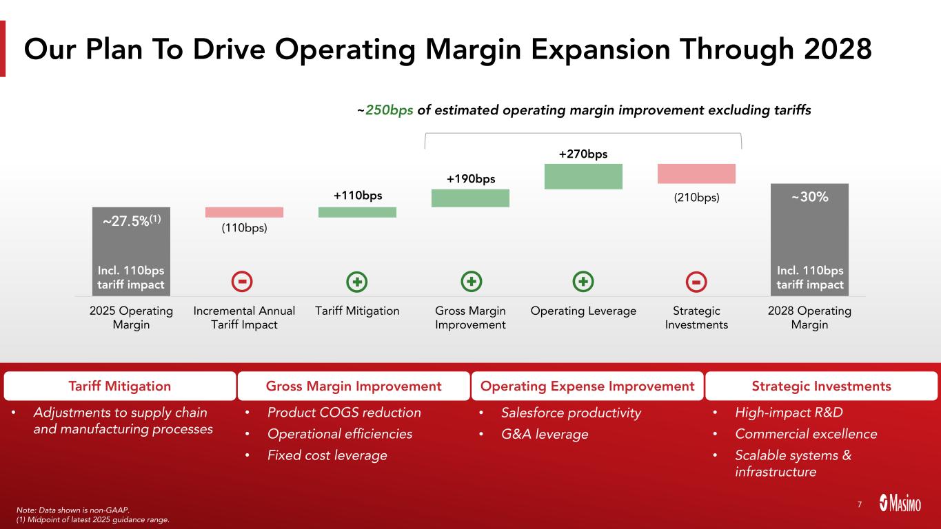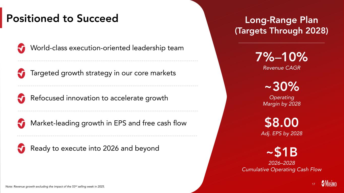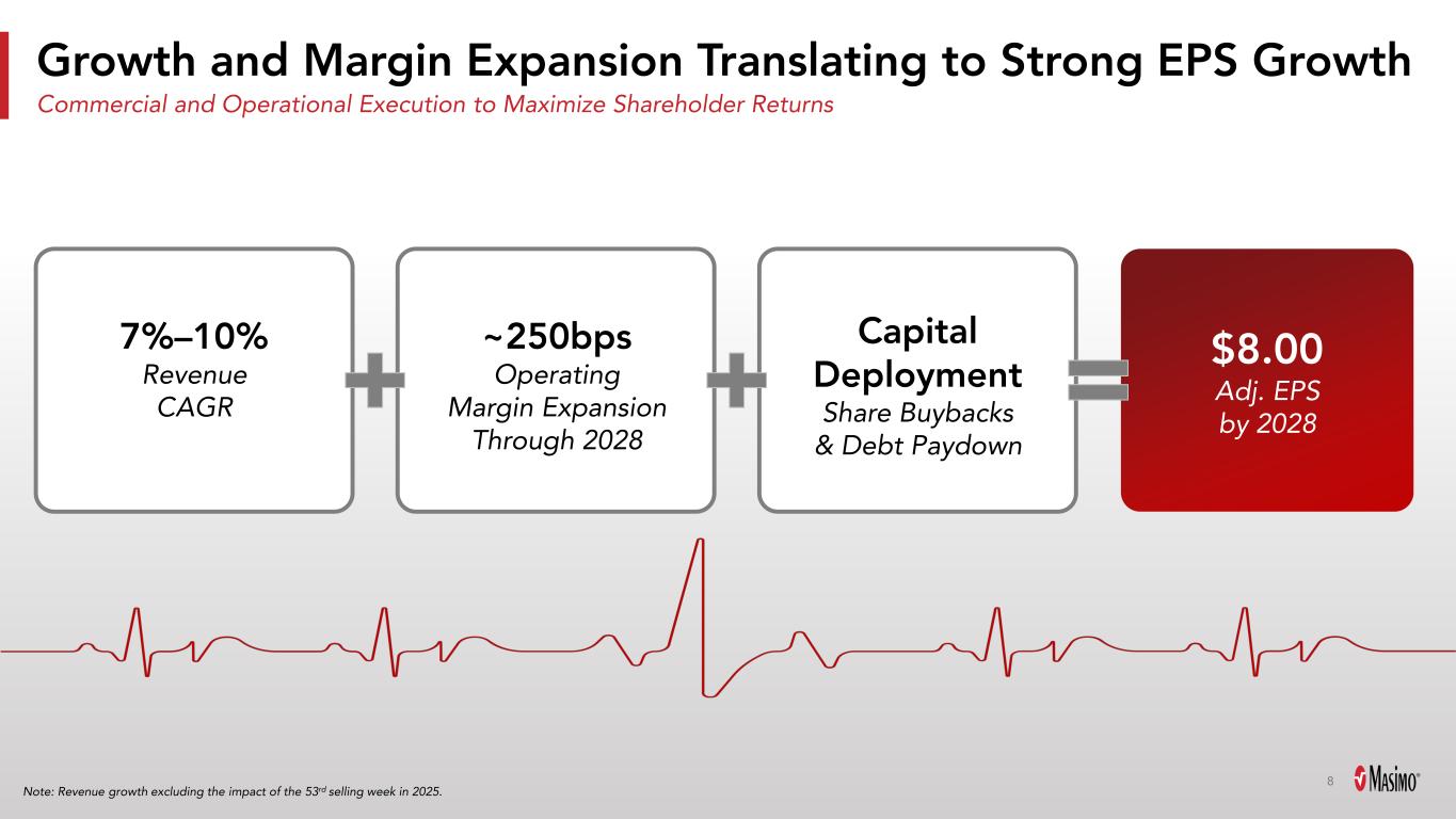 注:收入增长,不包括2025年第53个销售周的影响。扩展高级监测2.50% – 3.00% 7% – 10%持久的长期增长麦斯莫的增长算法推动实现两位数增长退出2028年加速美国脉冲OX增长2.75% – 3.75%执行新产品推出全球增长贡献渗透国际脉冲OX市场1.75% – 2.25%提高国际脉冲OX市场份额+++ 1.00% 11