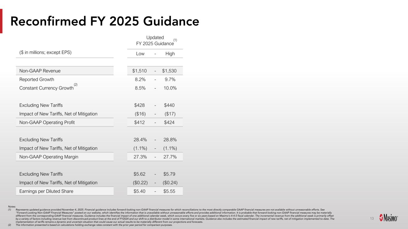 重新确认的2025财年指导说明:(1)代表2025年11月4日提供的更新指导。财务指导包括前瞻性的非GAAP财务指标,如果不做出不合理的努力,就无法获得与最直接可比的GAAP财务指标的对账。请参阅我们网站上发布的“前瞻性非公认会计原则财务措施”,该措施确定了没有不合理努力就无法获得的信息,并提供了额外信息。前瞻性的非GAAP财务指标很可能与相应的GAAP财务指标存在重大差异。该指南包括额外一个日历周的财务影响,该影响根据麦斯莫的4-4-5财政日历每五年或六年发生一次。额外一周带来的增量收入主要被多种因素所抵消,包括2024财年末停产产品线带来的收入损失,以及我们在一些国际市场转向分销商模式。指导意见还包括新关税的估计财务影响,扣除迄今为止实施的缓解措施。关税的实施仍然是一个动态和不确定的情况,可能导致我们的实际结果与我们的预测和预测存在重大差异。(2)所提供的信息是基于保持汇率与上一年期间不变的计算,以便进行比较。(1)(2)(百万美元;不包括EPS)低-高非GAAP收入$ 1,510-$ 1,530报告增长8.2%-9.7%不变货币增长8.5%-10.0%不包括新关税$ 428-$ 440新关税影响,扣除缓解($ 16)-($ 17)非GAAP营业利润$ 412-$ 424不包括新关税28.4%-28.8%新关税影响,扣除缓解(1.1%)-(1.1%)非GAAP营业利润率27.3%-27.7%不包括新关税$ 5.62-$ 5.79新关税影响,扣除缓解($ 0.22)-($ 0.24)每股摊薄收益$ 5.40-$ 5.55更新的2025财年指引13