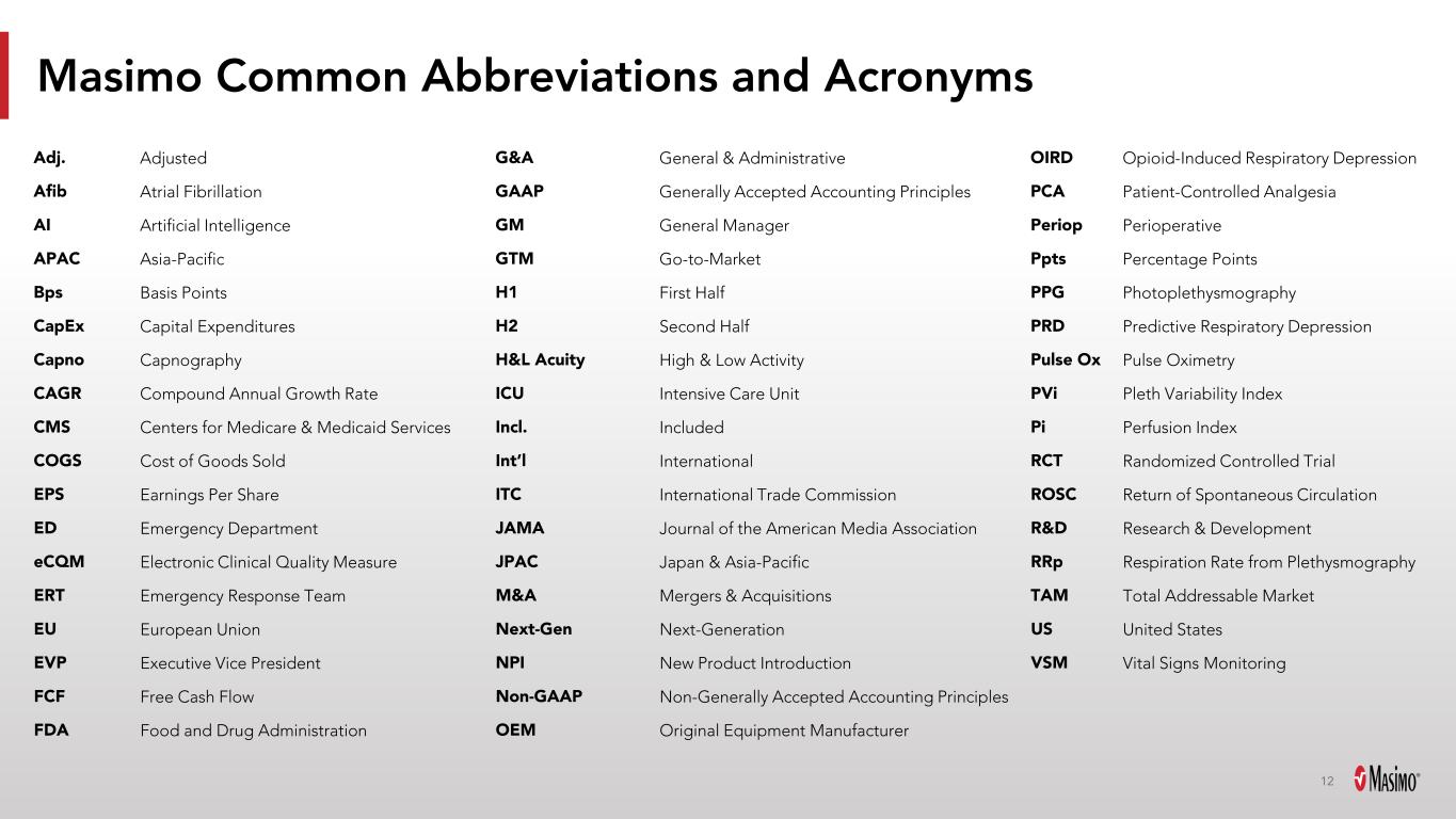 麦斯莫常见缩写和首字母缩略词Adj.调整后G & A一般和行政OIRD阿片类药物引起的呼吸系统抑郁症AFIb心房颤动GAAP公认会计原则PCA患者自控镇痛AI人工智能通用汽车总经理围术期亚太GTM上市PPTS百分点bps基点H1上半年PPG光电容积描记法CapEx资本支出H2下半年PRD预测性呼吸系统抑郁症Capno二氧化碳图H & L敏锐度高和低活动性脉冲Ox脉搏血氧仪CAGR复合年增长率ICU重症监护病房PVi Pleth可变性指数CMS Centers for Medicare & Medicaid Services Incl。纳入PI灌注指数COGS销货成本INT’l International RCT随机对照试验EPS每股收益ITC International Trade Commission ROSC回归自发循环ED急诊部门JAMA Journal of the American Media Association研发研发eCQM电子临床质量测量JPAC Japan & Asia-Pacific RRP呼吸率来自Plethysmography ERT应急响应团队并购并购TAM总可寻址市场欧盟欧盟下一代美国下一代EVP执行副总裁NPI新产品介绍VSM生命体征监测丨FCF 丨FCF自由现金流非GAAP非公认会计原则FDA Food和药品监督管理局OEM原始设备制造商12