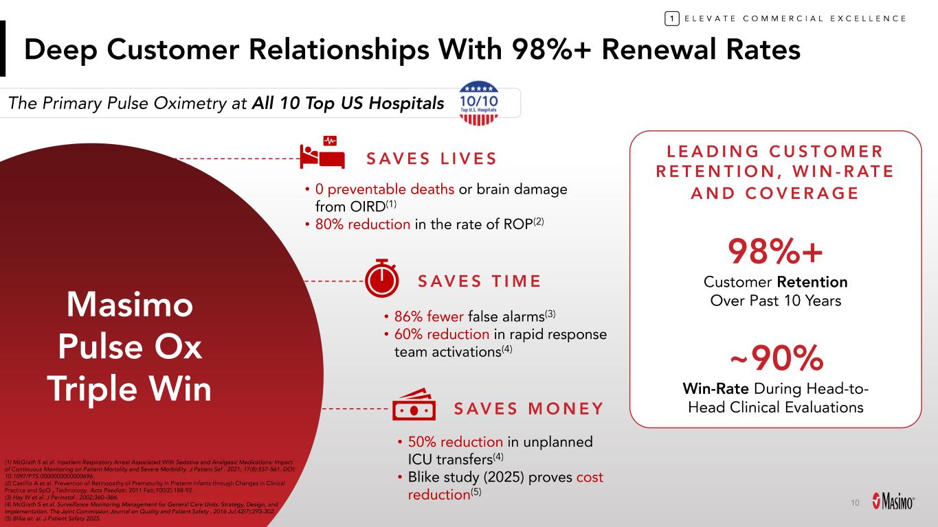 提升商业卓越1深度客户关系,98% +续保率10 •计划外ICU转移减少50%(4)• Blike研究(2025年)证明成本降低(5)美国所有10家顶级医院的初级脉搏血氧仪98% +过去10年的客户保留率~90%的赢率在头对头临床评估期间导致客户保留,赢率和覆盖率•0可预防的OIRD死亡或脑损伤(1)• ROP发生率降低80%(2)挽救生命节省金钱•误报减少86%(3)•快速反应团队激活量降低60%(4)节省时间麦斯莫 Pulse OX Triple Win(1)McGrath S等人。与镇静和镇痛药物相关的住院呼吸骤停:持续监测对患者死亡率和严重发病率的影响。J患者SAF。2021; 17(8):557 -561.DOI:10.1097/PTS.0000000000000696。(2)Castillo A等.通过临床实践和SPO 2技术的改变预防早产儿视网膜病变。儿科学报。2011年2月;100(2):188-92。(3)Hay W et al. J Perinatol。2002;360 –366.(4)McGrath S et al. Monitoring Monitoring Management for General Care Units:Strategy,Design,and Implementation。质量和患者安全联合委员会期刊。2016年7月;42(7):293-302。(5)Blike et. al. J Patient Safety 2025。