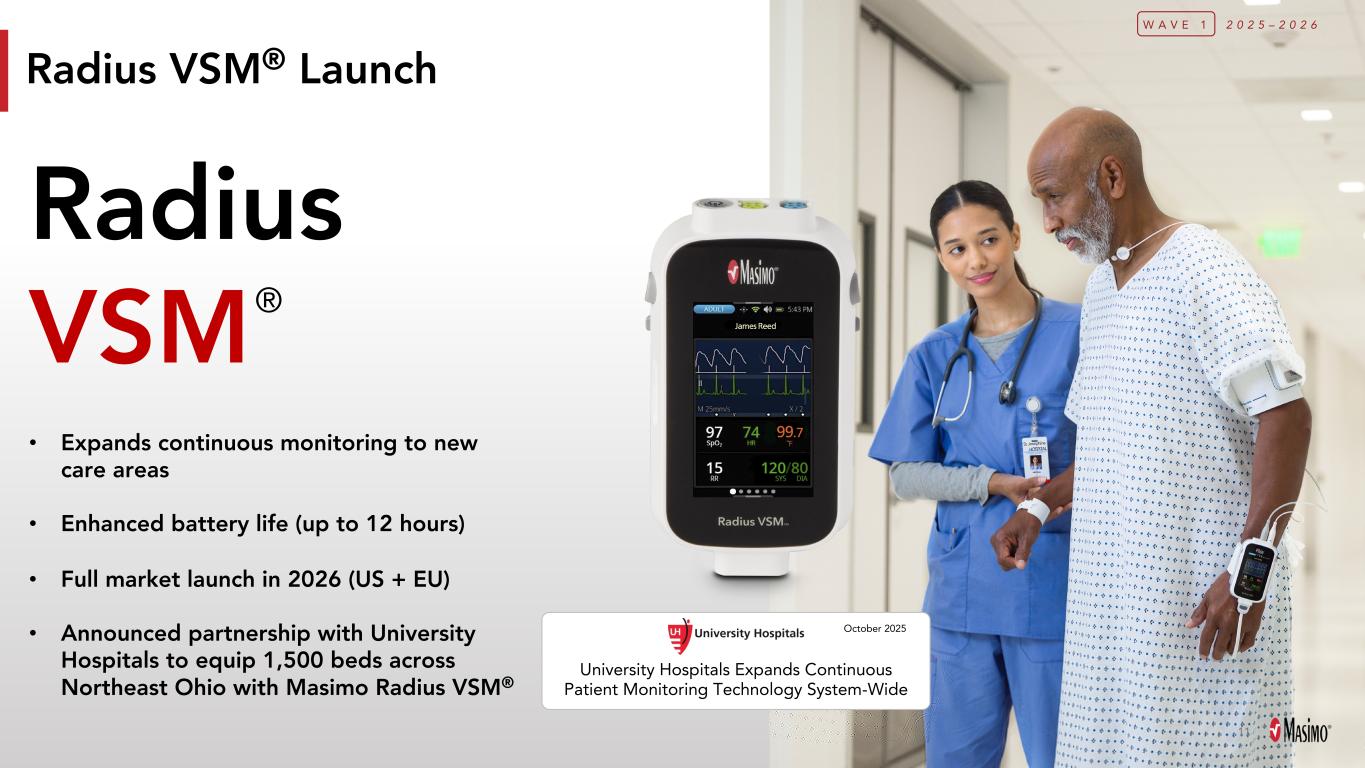 W A V E 32028 + Radius VSM •将连续监测扩展到新的护理区域•增强的电池寿命(最长12小时)• 2026年全面市场启动(美国+欧盟)•宣布与大学医院合作,在俄亥俄州东北部为1,500张床位配备麦斯莫 Radius VSM®半径VSM®Launch 15 – 2026大学医院扩展连续患者监测技术全系统2025年10月®11