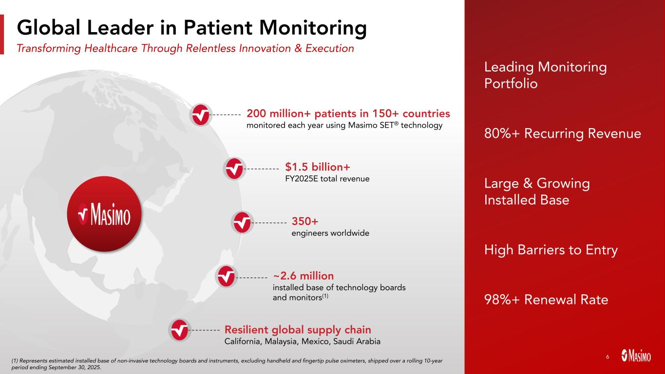 患者监测领域的全球领导者(1)代表估计的非侵入性技术板和仪器的安装基数,不包括手持式和指尖脉搏血氧仪,在截至2025年9月30日的10年滚动期间发货。全球350 +工程师每年使用麦斯莫 SET监测150 +国家的2亿+患者®技术~260万安装基数的技术板和显示器(1)15亿美元+ FY2025E总收入通过不懈的创新和执行弹性改变医疗保健全球供应链加州、马来西亚、墨西哥、沙特阿拉伯领先的监测组合80% +经常性收入大&不断增长的安装基数高进入壁垒98% +续费率6