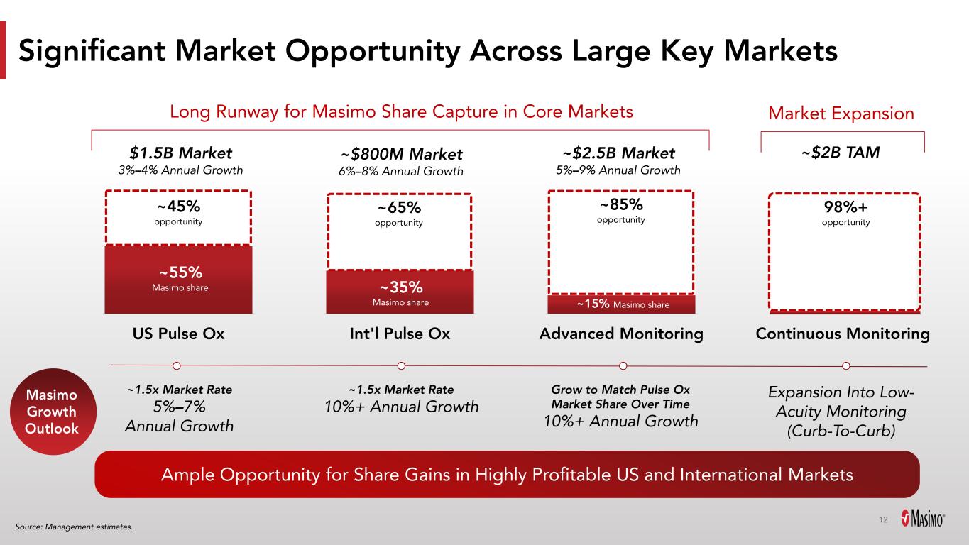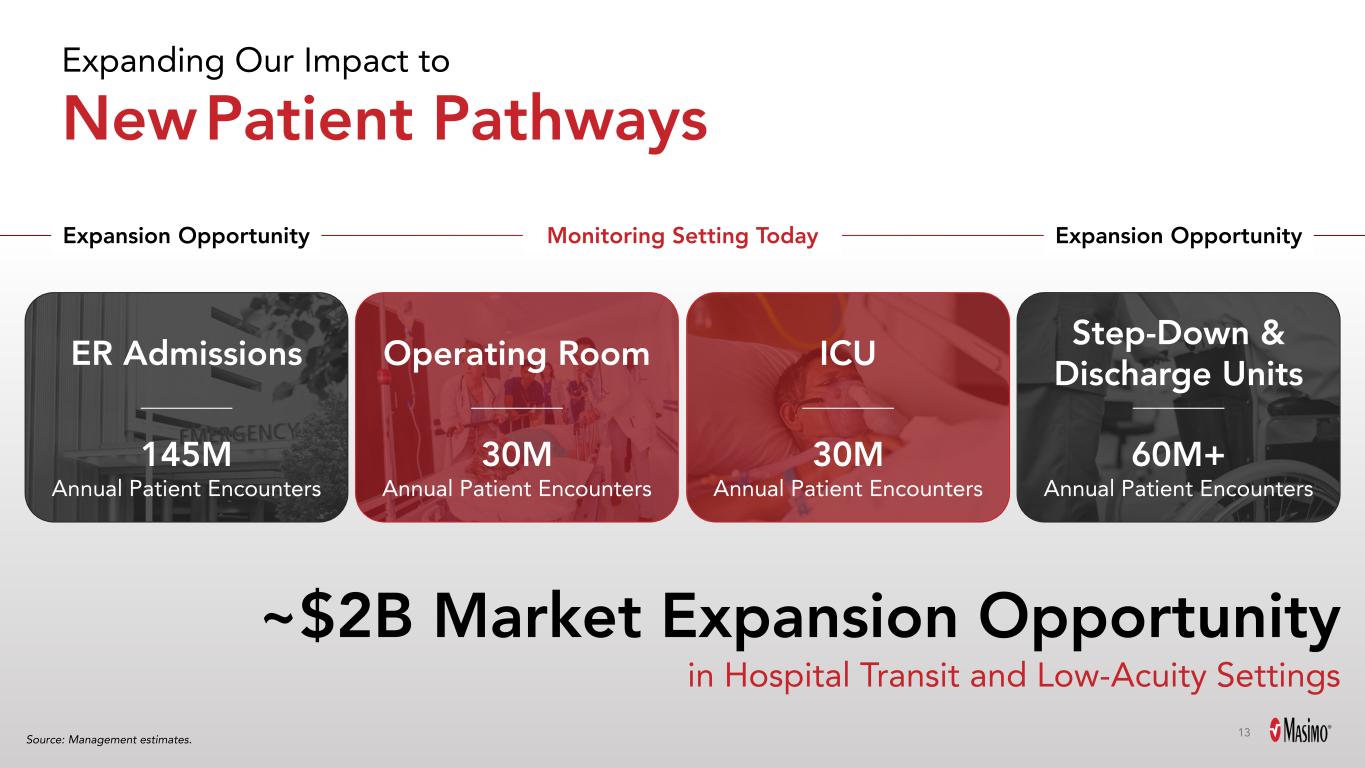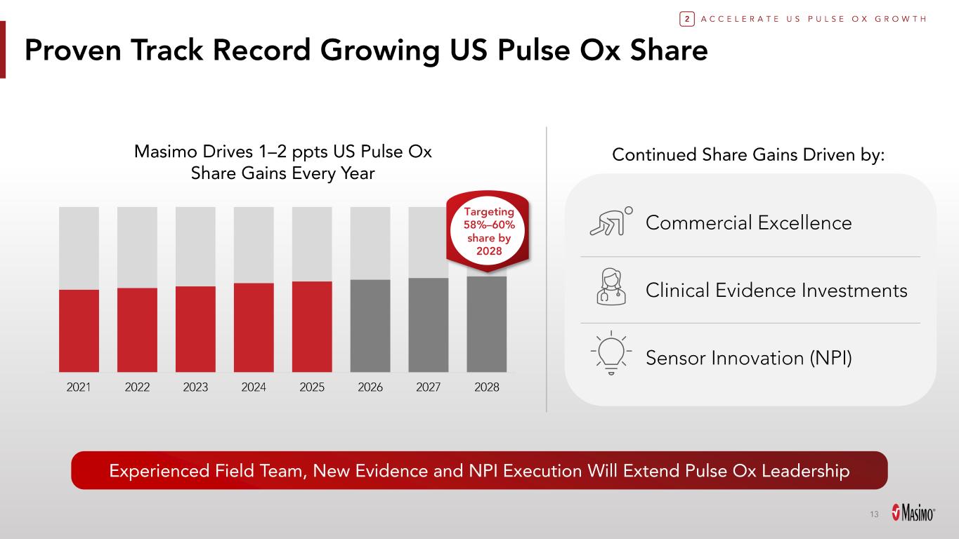 跨越大型关键市场的重大市场机会美国Pulse OX INT'l Pulse OX Advanced Monitoring Continuous Monitoring~55% 麦斯莫份额~35% 麦斯莫份额~15% 麦斯莫份额$ 1.5B市场3% – 4%年增长~$ 800M市场6% – 8%年增长~$ 2.5B市场5% – 9%年增长~45%机会~65%机会~85%机会98% +机会~$ 2B TAM~1.5x市场利率5% – 7%年增长~1.5x市场利率10% +随着时间的推移,年增长将与Pulse OX市场份额相匹配10% +年增长扩展至低锐度监测(Curb-To-Curb)长期跑道为麦斯莫在核心市场的份额扩张丨Masim高利润的美国和国际市场的股票收益来源:管理层估计。12