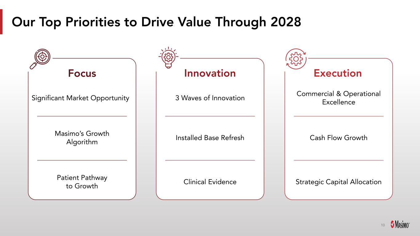 商业&运营卓越现金流增长战略资本配置执行创新3波创新装基刷新临床证据焦点重大市场机会麦斯莫的增长算法患者增长途径我们的首要任务是推动价值到2028年10