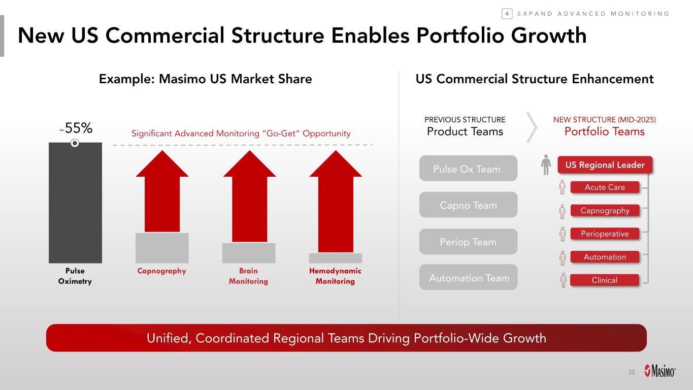 扩大先进的监测4示例:麦斯莫美国市场份额脉冲血氧饱和度二氧化碳图脑监测血流动力学监测~55%显着的高级监测“Go-Get”机会新的美国商业结构Structure使投资组合增长美国商业TERM0结构Structure增强统一,协调的区域团队推动投资组合-广泛增长先前结构产品团队Capno团队新结构(MID-2025)投资组合团队Pulse Ox团队Periop团队自动化团队急性护理二氧化碳图围术期自动化临床美国区域领导者22