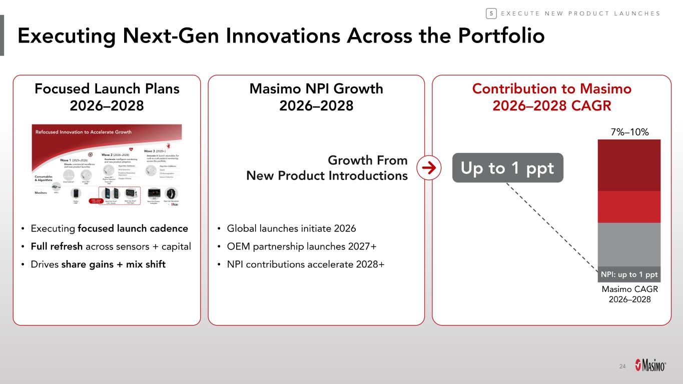 执行新产品launchES5 NPI:在整个投资组合中执行高达1ppt的下一代创新对麦斯莫的贡献2026 – 2028 CAGR丨MASIMO 麦斯莫 CAGR2026 – 2028 7% – 10%高达1ppt丨MASIMO 麦斯莫 NPI增长2026 – 2028来自新产品推出的增长•全球发布启动2026 • OEM合作伙伴关系发布2027 + • NPI贡献加速2028 +重点发布计划2026 – 2028 •执行重点发布节奏•跨传感器+资本的全面刷新•推动份额增长+混合转移24