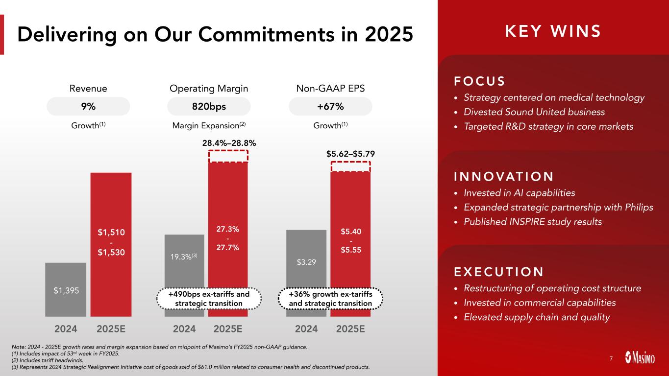 F O C US •以医疗技术为核心的战略•剥离Sound United业务•在核心市场采取有针对性的研发战略I N N O VAT I O N •投资于AI能力•扩大与飞利浦的战略合作伙伴关系•公布InspIRE研究结果E X E C U T I O N •重组运营成本结构•投资于商业能力•提升供应链和质量注:2024-2025年的增长率和利润率扩张基于麦斯莫 2025财年非公认会计原则指导的中点。(1)包括2025财年第53周的影响。(2)包括关税逆风。(3)表示与消费者健康和停产产品相关的2024年战略调整倡议销售商品成本6100万美元。KEY WINS 2024 2025E 9%收入增长(1)2024 2025E 28.4% – 28.8% 19.3%(3)27.3%-27.7% 820bps营业利润率扩张(2)+ 490bps除关税和战略过渡2024 2025E 3.29美元5.40美元-5.55美元5.62美元-5.79美元非公认会计准则每股收益+ 67%增长(1)+ 36%增长除关税和战略过渡在2025年兑现我们的承诺7美元1,395美元1,510美元-1,530美元