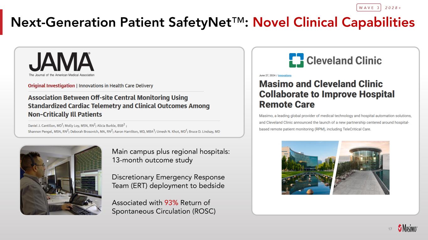 WAVE 32028 +(1)AHA生存期统计(cpr.heart.org)。(2)Balshi et. al. 2023。(3)Cantillon et. al. 2016。具有关键临床益处的实质性广度+机会麦斯莫患者Safetynet安装在:• 850家医院(占美国医院的18%)•覆盖48,000张床位降低漏诊事件快速反应和有效性供应商不可知论降低了ICU住院时间长度,死亡率和并发症发生率恢复自发循环(ROSC)率:25%非ICU美国医院平均(1)麦斯莫麦斯莫当前患者Safetynet(2)60% TERM0下一代患者Safetynet(3)93%集中患者监测:大型前瞻性结果研究和与克利夫兰诊所的创新合作伙伴关系支持的下一代患者Safetynet 16
