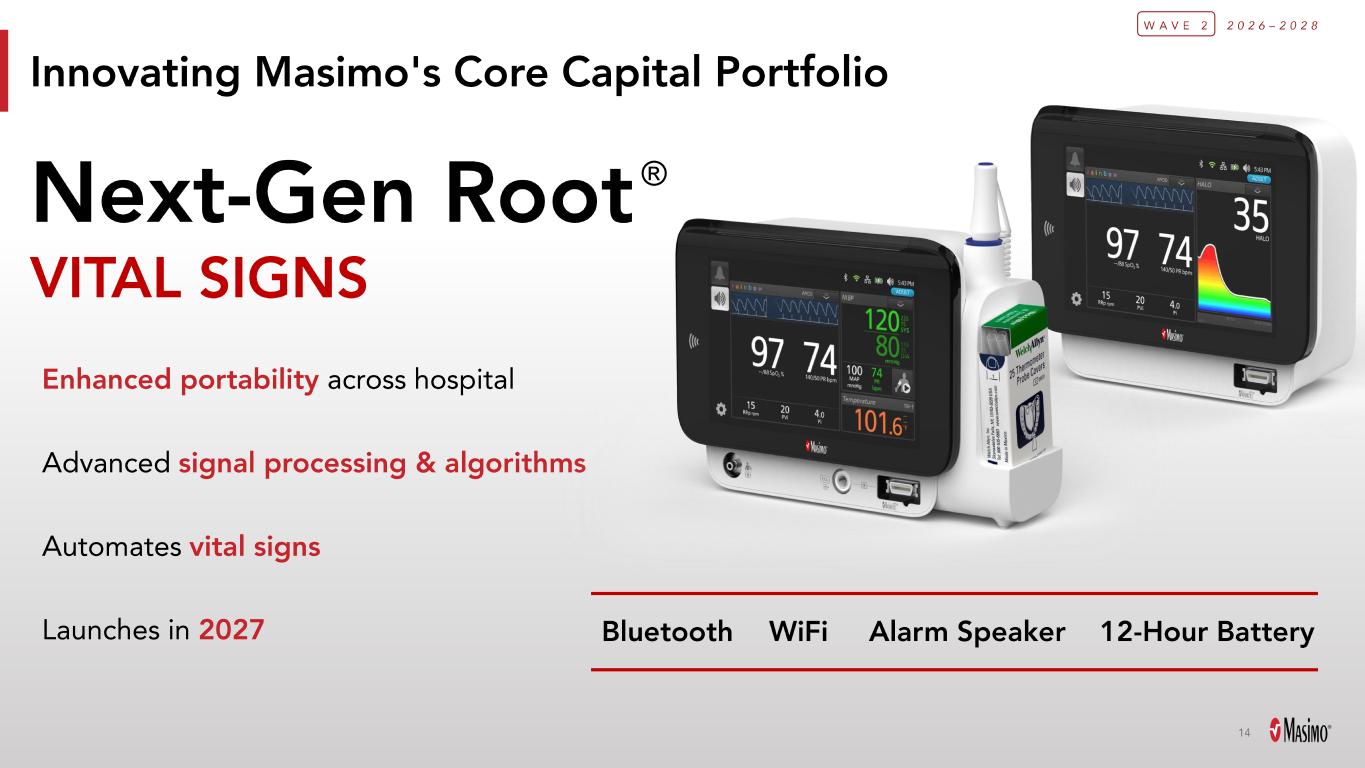 WAVE22026 – 2028 Next Gen Root VITAL SIGNS增强了跨医院的便携性高级信号处理和算法自动化生命体征蓝牙WiFi报警扬声器12小时电池创新麦斯莫的核心资本组合将于2027年推出®14