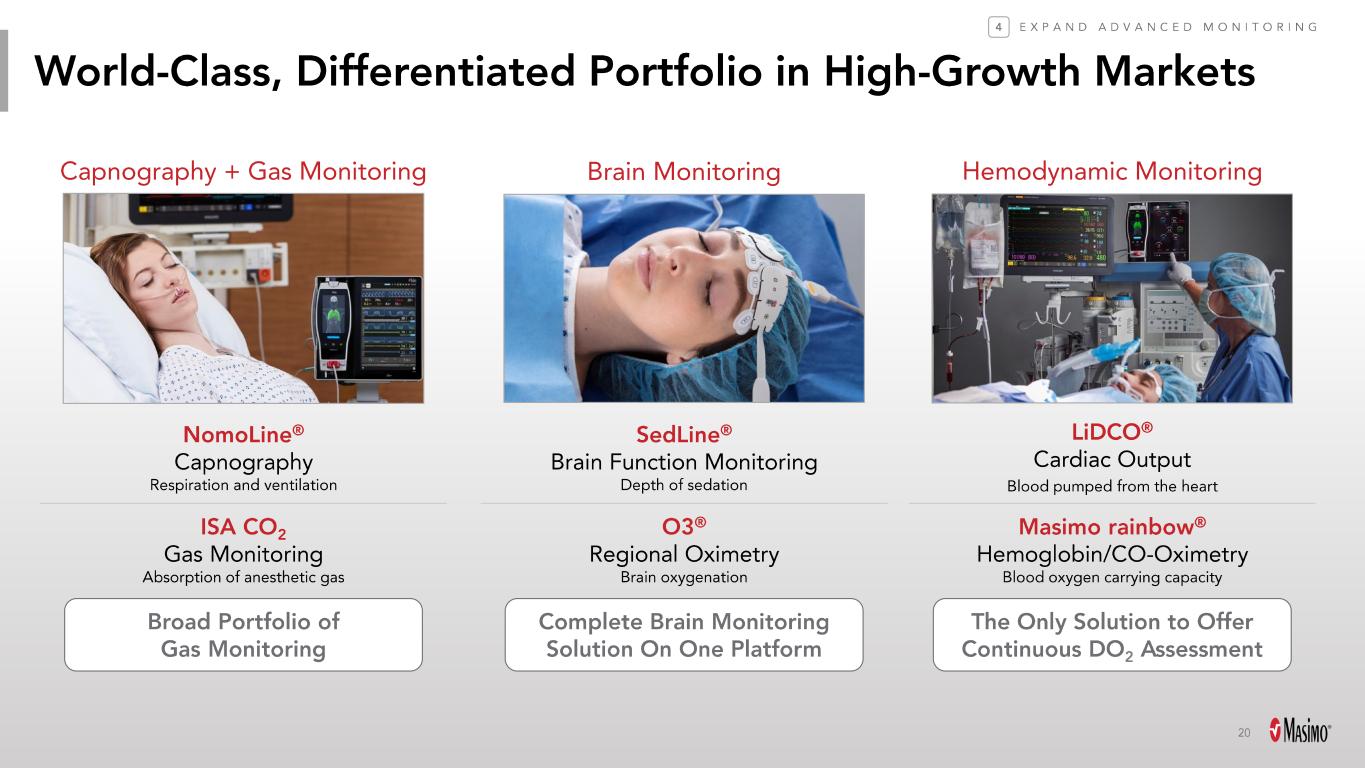 Expand Advanced Monitoring4世界级、高增长市场中的差异化投资组合NomoLine®二氧化碳图呼吸通气ISA CO2气体监测吸收麻醉气体SedLine®镇静O3的脑功能监测深度®区域血氧仪脑氧合liDCO®从心脏泵出的心脏输出血麦斯莫彩虹®血红蛋白/CO-血氧仪血氧携带量广泛组合气体监测二氧化碳图+气体监测脑监测完整脑监测解决方案在一个平台血流动力学监测唯一提供连续DO2评估的解决方案20