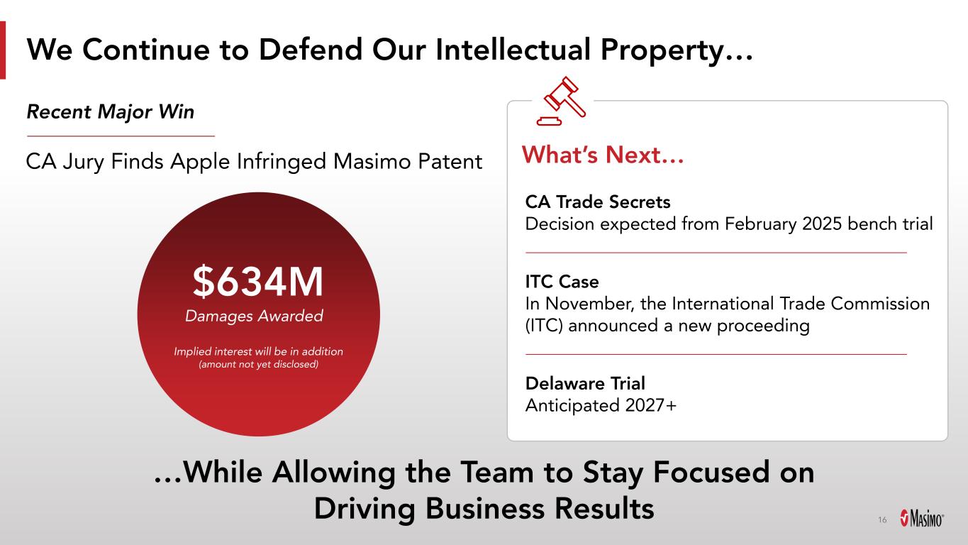 ITC案11月,国际贸易委员会(ITC)宣布了一项新的诉讼程序,我们将继续捍卫我们的知识产权……同时让团队始终专注于推动业务成果下一步会发生什么……加利福尼亚州商业秘密决定预计从2025年2月的庭审开始,6.34亿美元的损害赔偿将被授予额外的隐含利息(金额尚未披露)最近的重大胜利加利福尼亚州陪审团裁定苹果侵犯了麦斯莫TERM2专利特拉华州审判预计2027 + 16