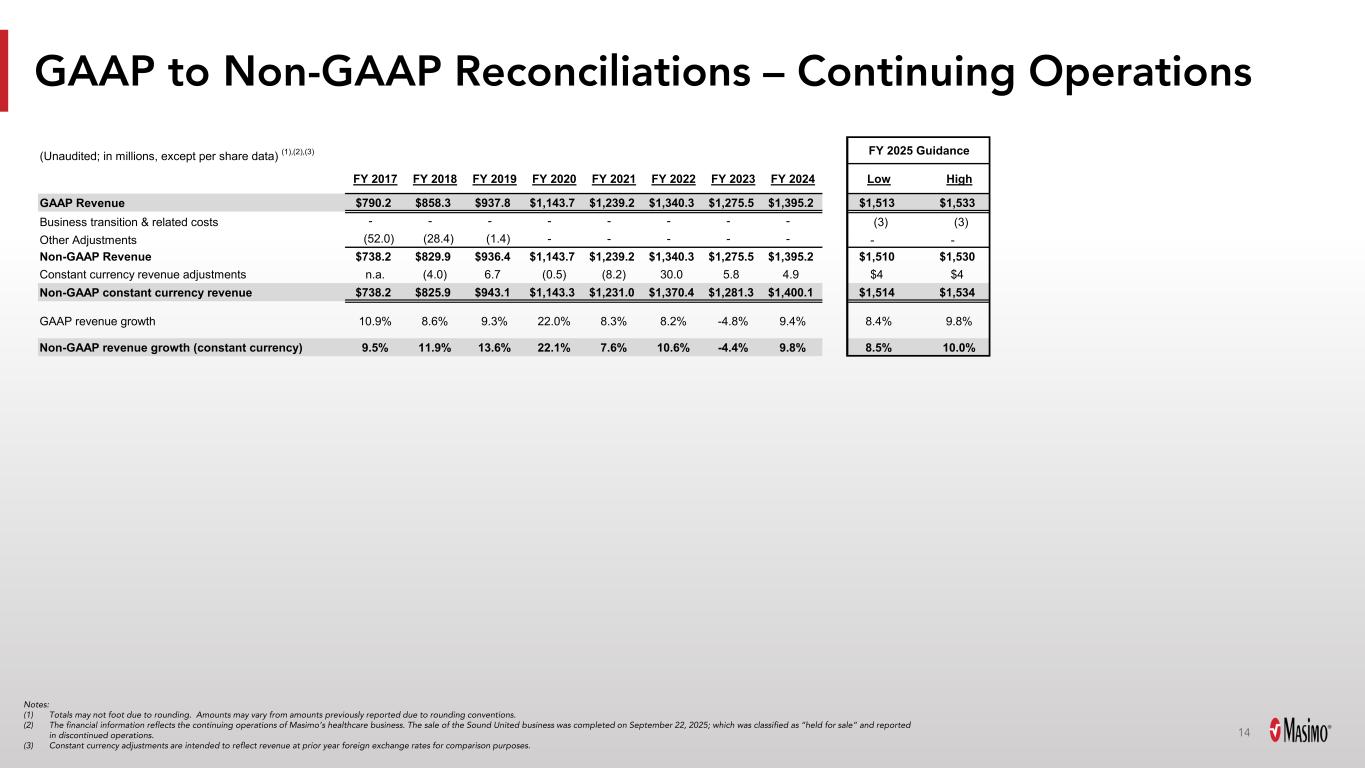 GAAP与Non-GAAP对账–持续经营注意事项:(1)由于四舍五入,总数可能不够。由于四舍五入的惯例,金额可能与先前报告的金额有所不同。(二)财务信息反映麦斯莫医疗健康业务的持续经营情况。出售Sound United业务已于2025年9月22日完成;该业务被分类为“持作出售”并在已终止经营业务中报告。(3)不变的货币调整旨在反映按上一年外汇汇率计算的收入,以便进行比较。(未经审计;以百万计,每股数据除外)(1)、(2)、(3)2025财年指引2017财年2018财年2019财年2020财年2021财年2022财年2023财年2024财年低高GAAP收入790.2美元858.3美元937.8美元1,143.7美元1,239.2美元1,340.3美元1,275.5美元1,395.2美元1,513美元1,533美元业务过渡和相关成本------(3)(3)其他调整(52.0)(28.4)(1.4)-------非GAAP收入738.2美元829.9美元936.4美元1,143.7美元1,239.2美元1,340.3美元1,275.5美元1,395.2美元1,510美元1,530美元固定货币收入调整n.a.(4.0)6.7(0.5)(8.2)$ 1,370.4 $ 1,281.3 $ 1,400.1 $ 1,514 $ 1,534 GAAP收入增长10.9% 8.6% 9.3% 22.0% 8.3% 8.2%-4.8 % 9.4% 8.4% 9.8% Non-GAAP收入增长(固定货币)9.5% 11.9% 13.6% 22.1% 7.6% 10.6%-4.4 % 9.8% 8.5% 10.0% 14
