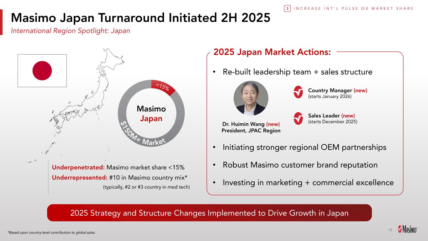 增加INT’L脉冲OX市场份额3 $ 1 5000万+市场*基于国家层面对全球销售的贡献。麦斯莫日本扭亏为盈启动2H 2025国际地区聚焦:日本国家经理(新)(2026年1月开始)销售领导者(新)(2025年12月开始)渗透不足:麦斯莫市场份额< 15%代表性不足:# 10在麦斯莫国家组合*(典型的,医疗技术中的# 2或# 3个国家)麦斯莫日本•重新构建领导团队+销售结构•启动更强大的区域OEM合作伙伴关系•稳固的麦斯莫客户品牌美誉度•投资于营销+商业卓越2025日本市场行动:实施2025战略和王慧敏TERM3博士(新任)JPAC地区总裁18