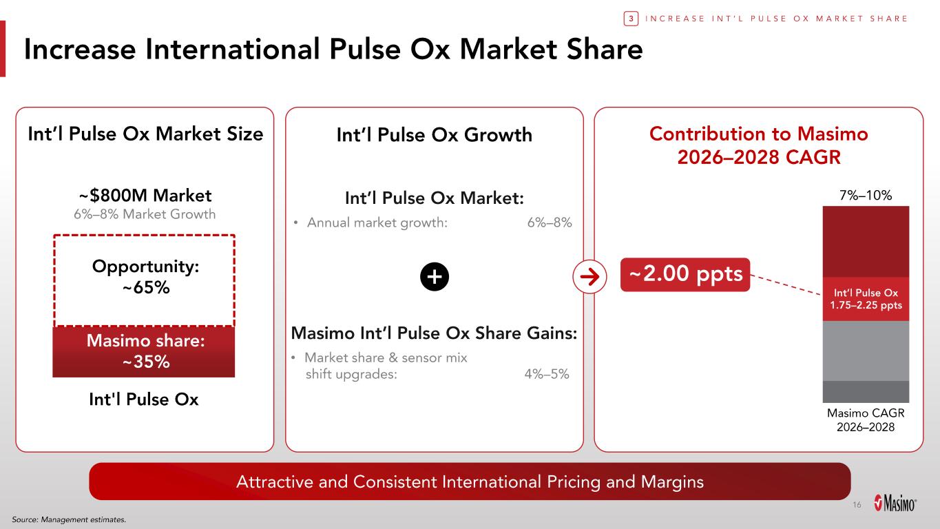 增加INT’l脉冲OX市场份额3 INT’l脉冲OX 1.75 – 2.25个百分点增加国际脉冲OX市场份额INT’l脉冲OX增长对麦斯莫的贡献2026 – 2028 CAGR TERM0 2026 – 20287% – 10%~2.00个百分点INT’l脉冲OX市场规模~8亿美元市场6% – 8%市场增长TERM0份额:~55% + INT’l脉冲OX机会:~65% 麦斯莫份额:~35% INT’l脉冲OX市场:•年市场增长:6% – 8% 麦斯莫 INT’l脉冲OX份额增长:••16