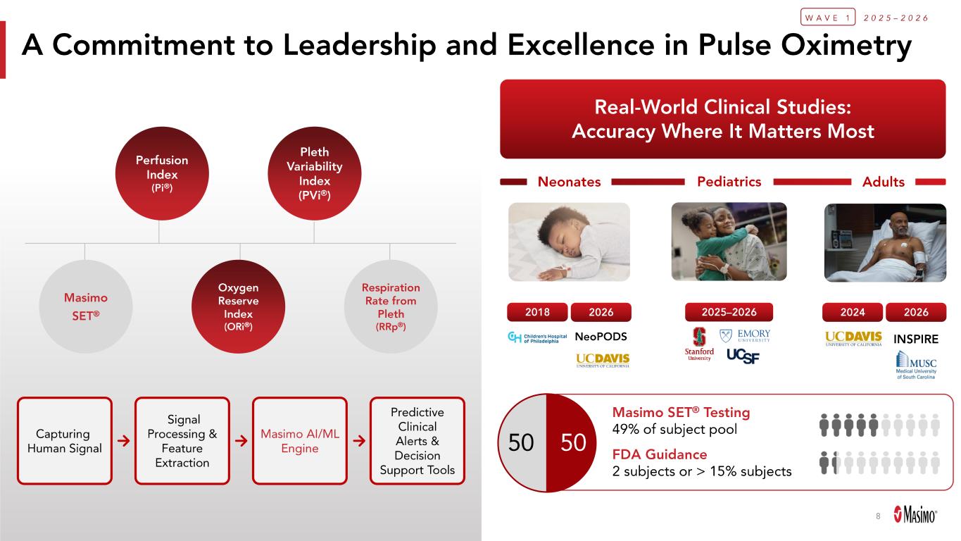 WAVE12025 – 2026 A承诺在脉搏血氧仪捕捉人体信号信号处理和特征提取方面保持领先和卓越的地位麦斯莫 AI/ML引擎预测性临床警报和决策支持工具麦斯莫 SET®检测49%的受试者池FDA指导2名受试者或> 15%受试者5050 NeoPODS儿科新生儿成人20182025 – 2026 InspIRE 麦斯莫集®氧气储备指数(ORI®)呼吸频率(RRP®)灌注指数(PI®)波纹变异指数(PVI®)真实世界临床研究:最重要的地方的准确性2026202420268