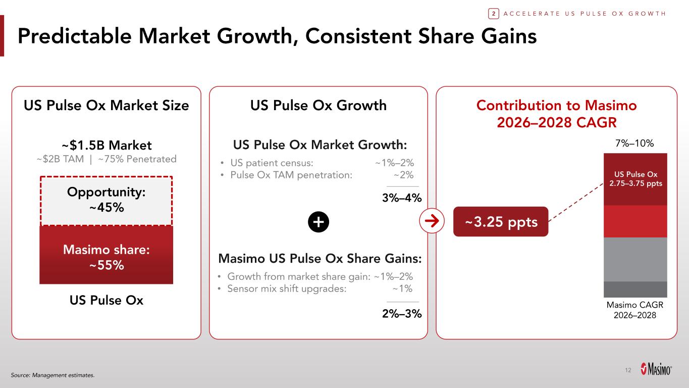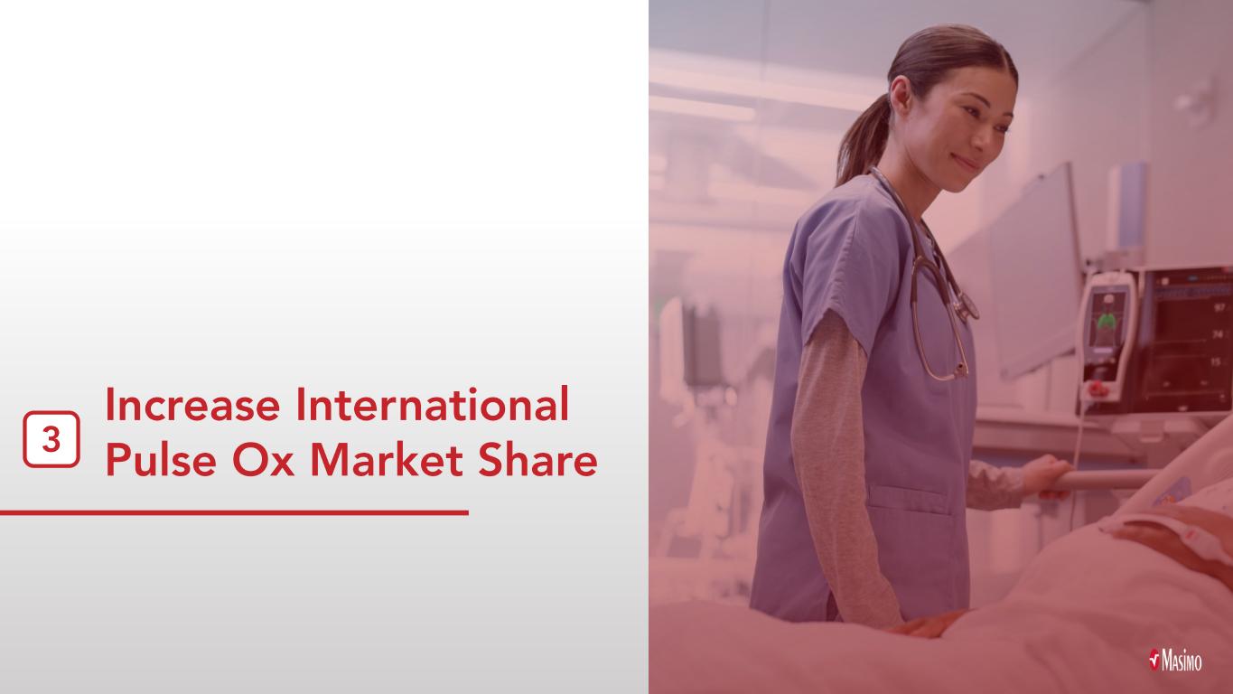 加速美国脉冲OX增长2可预测的市场增长,一致的份额增加美国脉冲OX美国脉冲OX市场规模~$ 1.5B市场~$ 2B TAM |~75%渗透的麦斯莫份额:~55%机会:~45% 7% – 10%美国脉冲OX 2.75 – 3.75个百分点对麦斯莫的贡献2026 – 2028复合年增长率TERM0 2026 – 2028~3.25个百分点美国脉冲OX增长美国脉冲OX市场增长:•美国患者普查:~1% – 2% •脉冲OX TAM渗透率:~2% 3% – 4% 麦斯莫美国脉冲OX份额增长:•来自市场份额增长的增长:12 7% –10%