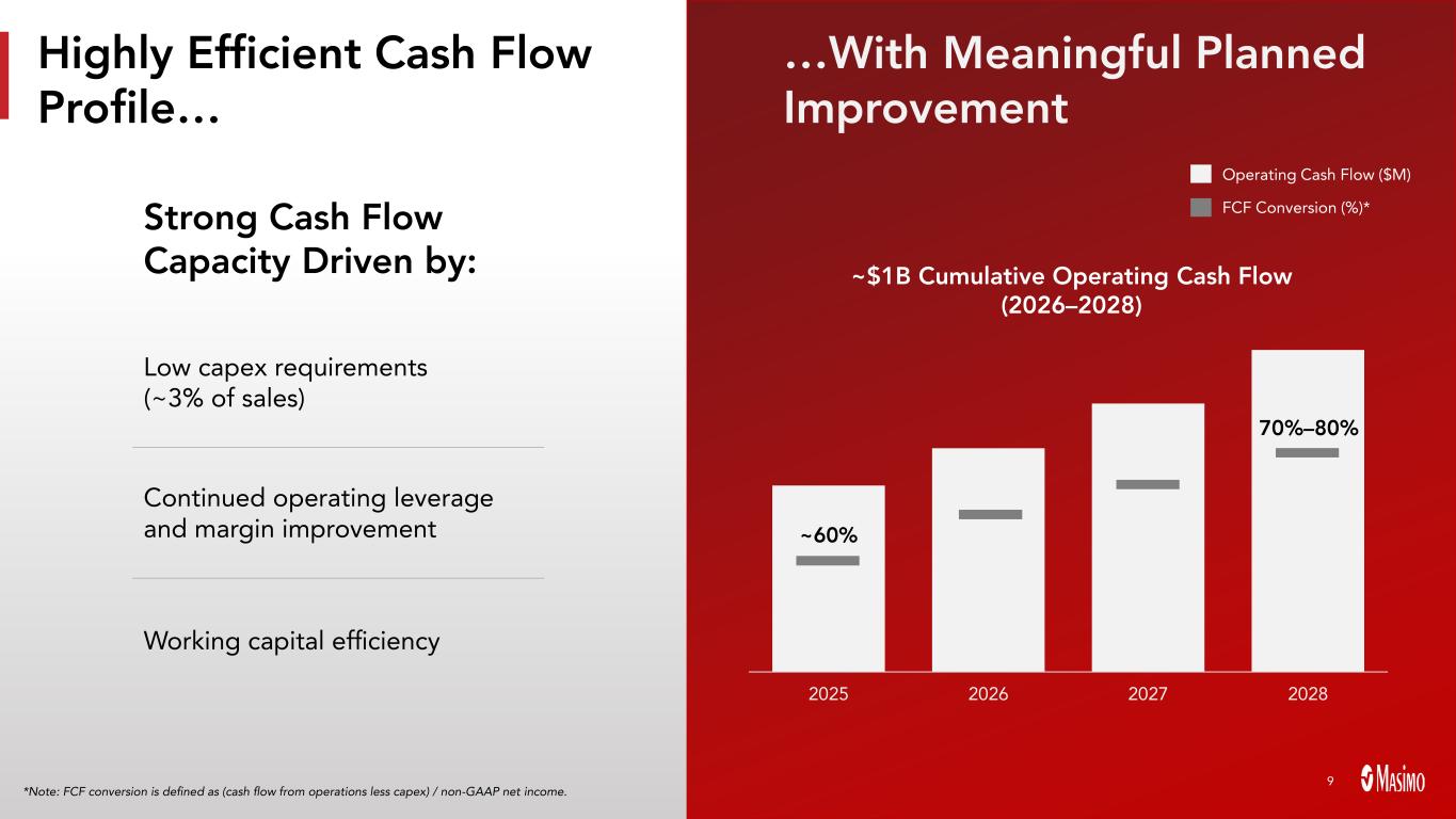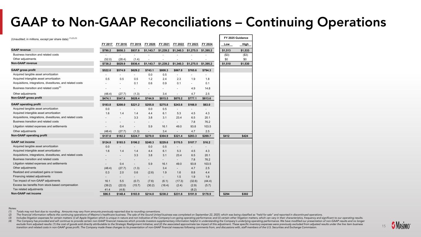 GAAP与Non-GAAP对账–持续经营注意事项:(1)由于四舍五入,总数可能不够。由于四舍五入的惯例,金额可能与先前报告的金额有所不同。(二)财务信息反映麦斯莫医疗健康业务的持续经营情况。出售Sound United业务已于2025年9月22日完成;该业务被归类为“持有待售”并在已终止经营业务中报告。(3)包括某些事项的诉讼费用:(i)所有性质独特且不代表公司持续经营业绩的Apple诉讼;以及(ii)某些其他诉讼事项,其特点、频率和对我们的经营业绩可能有所不同。(4)公司已提供并将继续提供某些非公认会计准则财务指标,这些指标为投资者提供了有助于了解公司基本经营业绩的补充信息。我们修改了我们对非公认会计原则结果的表述,不再从调整后的结果中排除:(1)直接归属于战略调整倡议的销售商品成本;(2)这一调整的相关近似税收影响。这些特定的库存费用以前被排除在调整后的结果下的细目业务过渡和相关成本在非公认会计准则毛利润。在美国证券交易委员会工作人员发表评论并与其进行讨论后,该公司对非GAAP财务指标的表述方式进行了这些更改。(未经审计;以百万计,每股数据除外)(1)、(2)、(3)2025财年指导2017财年2018财年2019财年2020财年2021财年2022财年2023财年2024财年低高GAAP收入790.2美元858.3美元937.8美元1,143.7美元1,239.2美元1,340.3美元1,275.5美元1,395.2美元1,513美元1,533业务过渡和相关成本-------($ 3)($ 3)其他调整(52.0)(28.4)(1.4)-----$ 0 $ 0非GAAP收入$ 738.2 $ 829.9 $ 936.4 $ 1,143.7 $ 1,239.2 $ 1,340.3 $ 1,275.5 $ 1,395.2 $ 1,510 $ 1,530 GAAP毛利润$ 522.0 $ 574.9 $ 629.2 $ 743.1 $ 808.3 $ 867.8 $ 765.6 $ 794.3获得的有形资产摊销---0.0 0.5---获得的无形资产摊销0.5 0.5 1.2 2.4 2.3 1.9 1.8收购、整合、剥离,和相关成本--0.10.6 0.9 0.1-0.1业务过渡和相关成本(4)------4.91 4.8其他调整(48.4)(27.7)(1.3)-3.4-4.7 2.5非GAAP毛利润$ 474.1 $ 547.6 $ 628.4 $ 744.9 $ 815.5 $ 870.2 $ 777.1 $ 813.6 GAAP营业利润$ 183.8 $ 208.0 $ 221.2 $ 255.8 $ 275.8 $ 243.6 $ 166.0 $ 63.0获得的有形资产摊销0.0---0.0 0.5--获得的无形资产摊销1.6 1.4 4.46.15.3 4.5 4.3收购、整合、剥离,和相关成本--3.3 3.8 3.12 3.46.52 0.1业务过渡和相关成本------7.876.2诉讼相关费用和和解-0.4-5.9 16.14 9.09 3.8 103.5其他调整(48.4)(27.7)(1.3)-3.4-4.7 2.5非GAAP营业利润$ 137.0 $ 182.2 $ 224.7 $ 270.0 $ 304.9 $ 321.4 $ 283.3 $ 269.7 $ 412 $ 424 GAAP净收入$ 124.8 $ 193.5 $ 196.2 $ 240.3 $ 229.6 $ 170.5 $ 107.7 $ 16.2获得的有形资产摊销0.0---0.0 0.5---获得的无形资产摊销1.6 1.4 4.46.15.3 4.54.3收购、整合、剥离,和相关成本--3.3 3.8 3.12 3.46.52 0.1业务过渡和相关成本------7.876.2诉讼相关费用和和解-0.4-5.9 16.14 9.09 3.8 103.5其他调整(48.4)(27.7)(1.3)-3.4-4.7 2.5已实现和未实现损益0.3 2.0 0.6(2.6)1.9 1.68.8 4.4融资相关调整-----1.5 1.9 1.9非公认会计原则调整的税收影响16.15.5(0.7)(7.6)(6.1)(17.3)(32.6)(44.4)股票薪酬产生的额外税收优惠(39.2)(22.0)(15.7)(30.2)(16.4)(2.4)(2.9)(5.7)与税收相关的调整41.4(4.8)----(8.2)-非公认会计原则净收益$ 96.5 $ 148.4 $ 183.9 $ 214.0 $ 238.2 $ 231.6 $ 191.9 $ 178.9 $ 294 $ 3021515