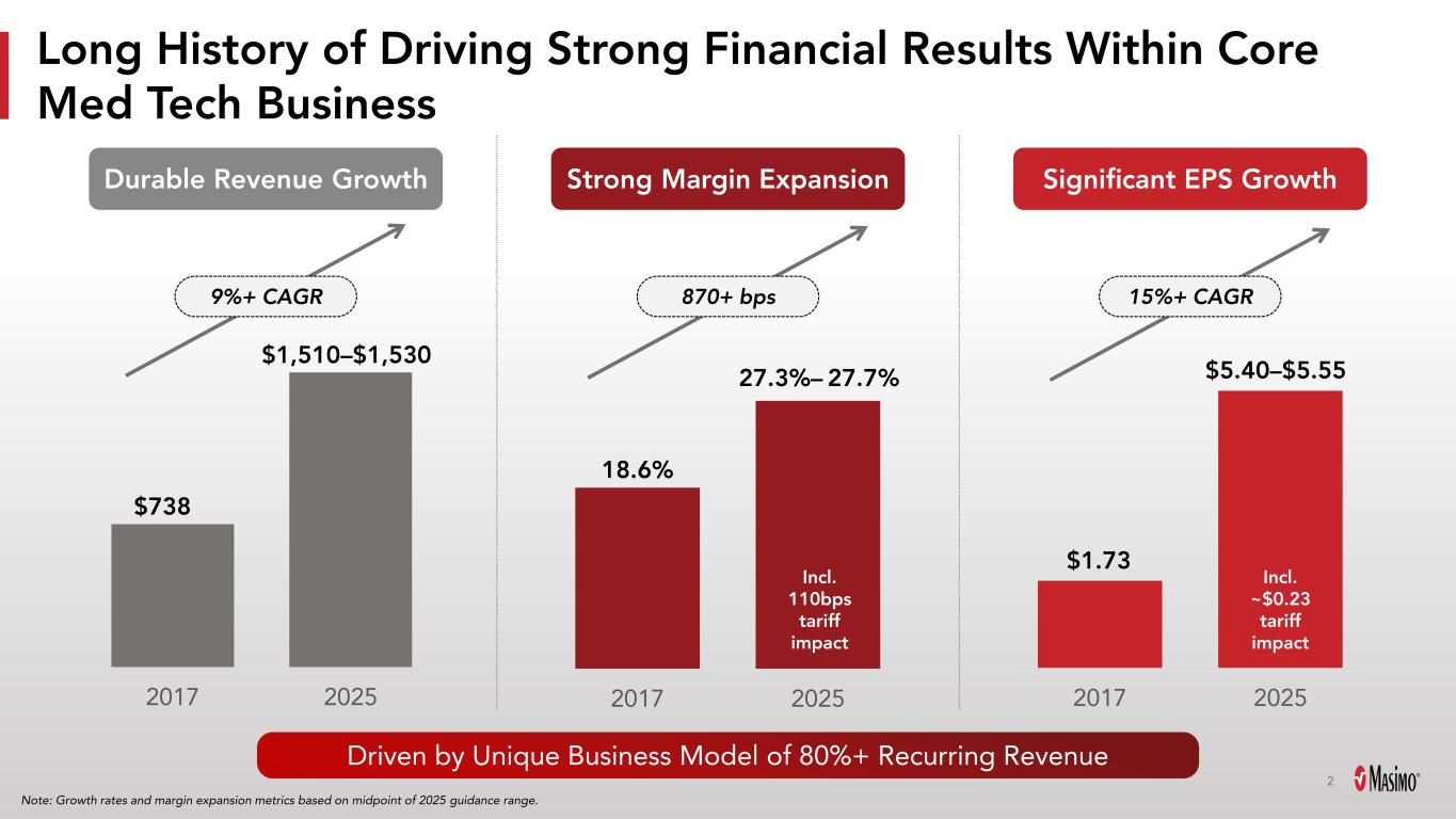 注:增长率和利润率扩张指标基于2025年指导范围的中点。在核心医疗技术业务中推动强劲财务业绩的悠久历史20172025 $ 738 $ 1,510 – $ 1,530持久收入增长9% + CAGR 2017202518.6% 27.3% – 27.7% Incl. 110bps关税影响强劲利润率扩张870 + bps显着每股收益增长20172025 $ 1.73 $ 5.40 – $ 5.55 Incl.~$ 0.23关税影响15% +复合年增长率驱动的独特商业模式80% +经常性收入2
