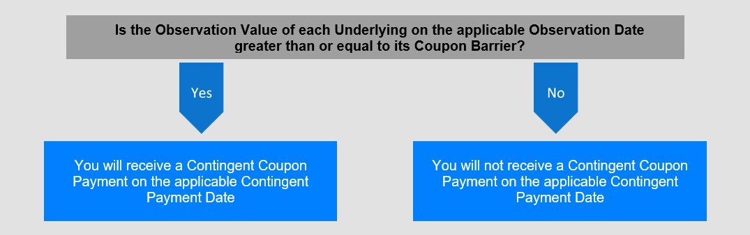 您可能不会收到任何或有息票付款。票据不提供任何定期固定息票支付。票据的投资者不一定会收到票据的任何或有息票付款。如果任何标的在某个观察日的观察值小于其票息障碍,您将不会收到适用于该观察日的或有票息支付。如果在票据期限内的所有观察日,任何标的的观察值均低于其票息壁垒,则在票据期限内,您将不会收到任何或有票息支付,也不会收到票据的正收益。
