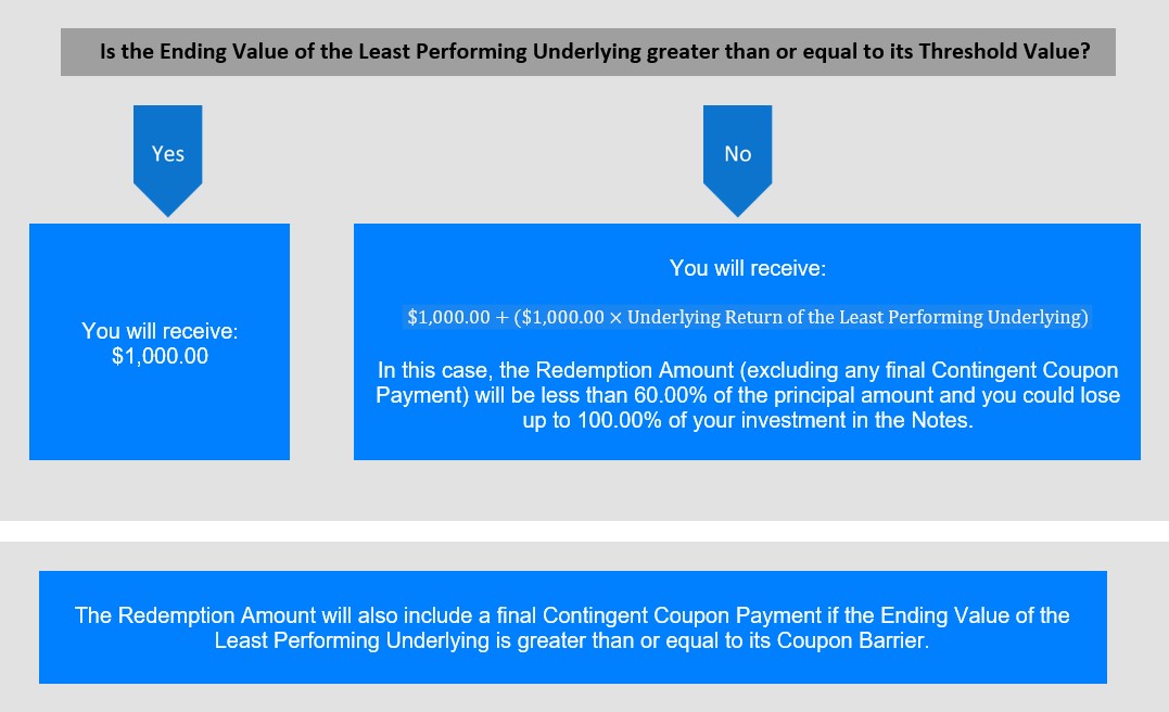 在这种情况下,赎回金额(不包括任何最终或有息票支付)将低于本金额的60.00%,您可能会损失高达100.00%的票据投资。