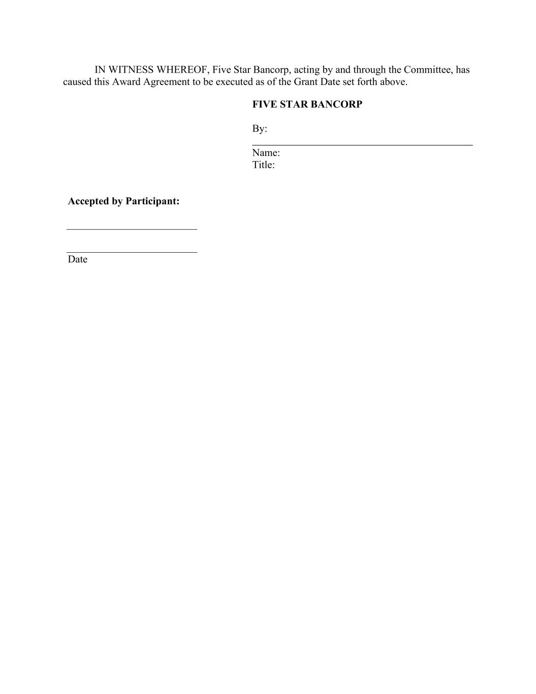 作为证明,Five Star Bancorp由委员会行事并通过委员会行事,已促使本授予协议自上述授予日起签立。FIVE STAR BANCORP by:Name:Title:Accepted by Participant:Date