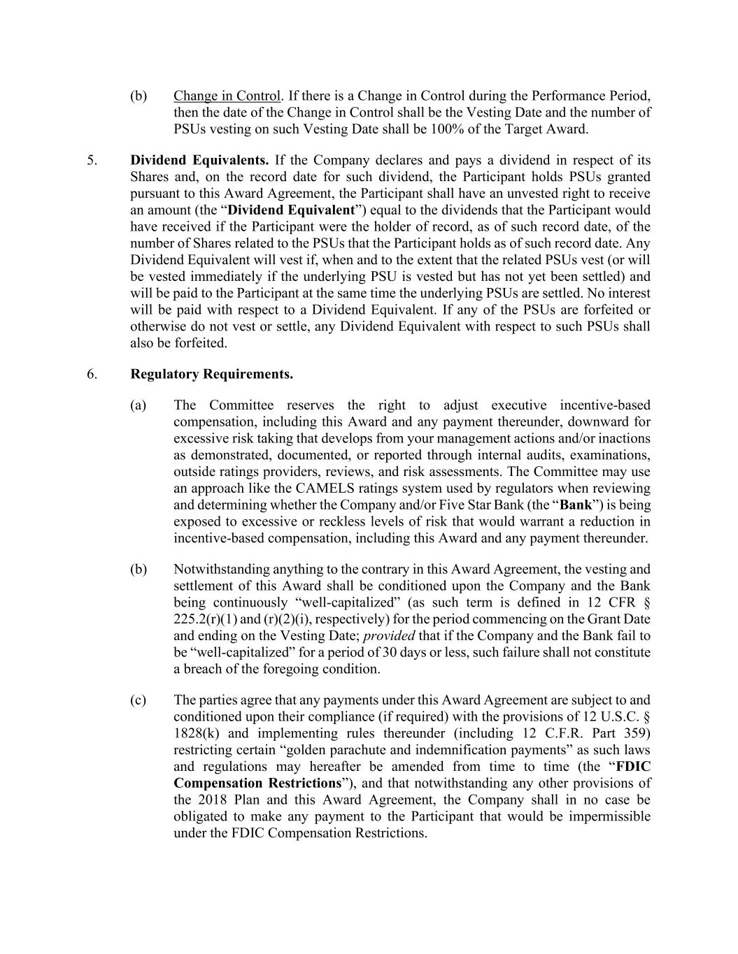 (b)控制权变更。如果在履约期内发生控制权变更,则控制权变更日期应为归属日,在该归属日归属的PSU数量应为目标奖励的100%。5.股息等价物。如果公司就其股份宣布并支付股息,并且在该股息的记录日期,参与者持有根据本授予协议授予的PSU,则参与者应拥有未归属的权利,以获得相当于参与者在该记录日期为记录持有人时在该参与者截至该记录日期持有的与PSU相关的股份数量中本应获得的股息的金额(“股息等值”)。任何股息等值将在相关PSU归属时、何时及在何种程度上归属(或在基础PSU已归属但尚未结算的情况下将立即归属),并将在基础PSU结算的同时支付给参与者。股息等值将不支付利息。如任何私营保安公司被没收或以其他方式不归属或结算,则与该等私营保安公司有关的任何等值股息亦须被没收。6.监管要求。(a)委员会保留将基于高管激励的薪酬(包括本奖及其项下的任何付款)向下调整的权利,以应对通过内部审计、检查、外部评级提供者、审查和风险评估证明、记录或报告的由你的管理行为和/或不作为发展而来的过度风险承担。委员会在审查和确定公司和/或五星银行(“银行”)是否面临过度或鲁莽的风险水平时,可能会使用类似监管机构使用的CAMELS评级系统的方法,这将需要减少基于激励的薪酬,包括本裁决及其下的任何付款。(b)尽管本奖励协议另有相反规定,本奖励的归属和结算须以公司和银行在授予日开始至归属日结束的期间内持续“资本充足”(该术语分别在12 CFR § 225.2(r)(1)和(r)(2)(i)中定义)为条件;但如果公司和银行未能在30天或更短的期间内“资本充足”,则该等失败不构成违反上述条件。(c)双方同意,本授标协议项下的任何付款均受制于(如有要求)遵守12 U.S.C. § 1828(k)及其下的实施规则(包括12 C.F.R. Part 359)的规定并以其为条件,这些规定限制了某些“金降落伞和赔偿付款”,因为这些法律和法规可能会在此后不时修订(“FDIC赔偿限制”),并且尽管2018年计划和本授标协议有任何其他规定,在任何情况下,公司都没有义务向参与者支付FDIC补偿限制下不允许的任何款项。