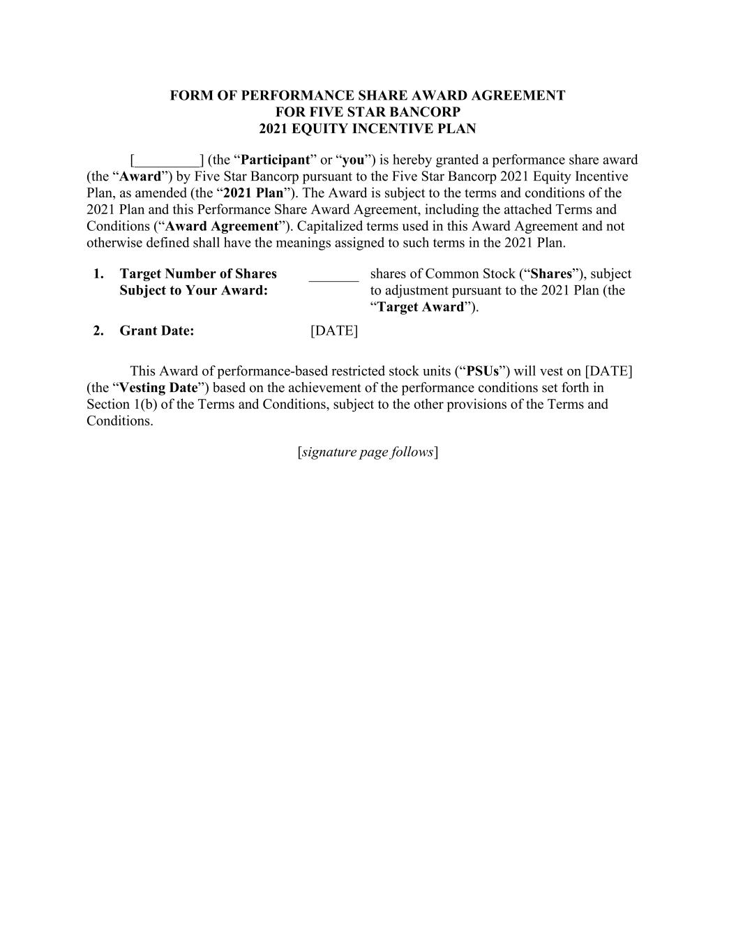 五星银行2021年度股权激励计划[ _________ ](“参与者”或“您”)的业绩份额授予协议的形式兹由Five Star Bancorp根据经修订的《Five Star Bancorp 2021年股权激励计划》(“2021年计划”)授予业绩份额奖励(“奖励”)。奖励受2021年计划和本业绩份额奖励协议的条款和条件,包括所附条款和条件(“奖励协议”)的约束。本授标协议中使用且未另行定义的大写术语应具有2021年计划中赋予此类术语的含义。1.受您奖励的目标股份数量:普通股股份(“股份”),可根据2021年计划进行调整(“目标奖励”)。2.授出日期:[日期]本次奖励基于业绩的限制性股票单位(“PSU”)将根据条款和条件第1(b)节规定的业绩条件的实现情况于[日期](“归属日期”)归属,但须遵守条款和条件的其他规定。【签名页如下】