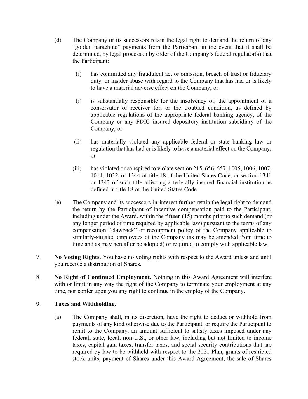 (d)公司或其继任者保留要求参与者返还任何“金降落伞”付款的合法权利,如果应通过法律程序或公司联邦监管机构的命令确定参与者:(i)对公司实施了任何欺诈行为或不作为、违反信托或信托义务或内部人滥用职权,已经或可能对公司产生重大不利影响;或(i)对破产负有重大责任,为其任命了一名保管人或接管人,或公司或公司任何FDIC受保存款机构子公司的相关联邦银行机构的适用法规所定义的问题状况;或(ii)已严重违反已经或可能对公司产生重大影响的任何适用的联邦或州银行法律或法规;或(iii)已违反或共谋违反《美国法典》第18条第215、656、657、1005、1006、1007、1014、1032或1344条,或此类所有权的第1341或1343条影响美国法典第18条定义的联邦保险金融机构。(e)根据适用于公司类似情况雇员的公司任何补偿“回拨”或补偿政策的条款(可能会不时修订,并可能在以后被采纳)或被要求遵守适用法律,公司及其利益继承人进一步保留要求参与者在该要求之前十五(15)个月内(或适用法律要求的任何更长时间)返还已支付给参与者的激励补偿的合法权利,包括根据奖励。7.没有投票权。除非且直到您收到股份分配,否则您对该奖励没有投票权。8.没有继续就业的权利。本授予协议不会以任何方式干扰或限制公司在任何时候终止与你的雇佣关系的权利,也不会授予你任何继续受雇于公司的权利。9.税收和扣缴。(a)公司有权酌情从参与者应支付的任何其他种类的款项中扣除或扣留,或要求参与者向公司汇出足以满足任何联邦、州、地方、非美国或其他法律规定的税款的金额,包括但不限于法律要求就2021年计划预扣的所得税、资本利得税、转让税和社会保障缴款、授予限制性股票单位、根据本授予协议支付股份、出售股份