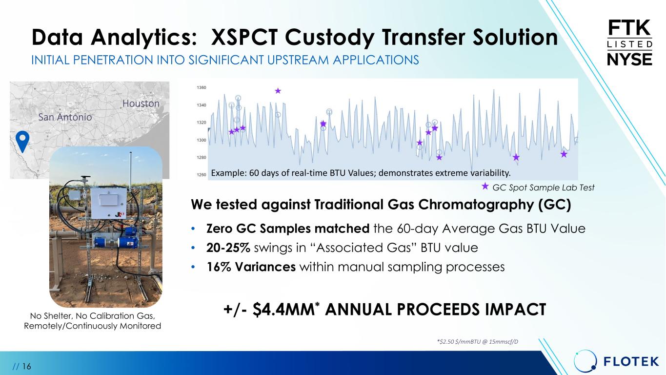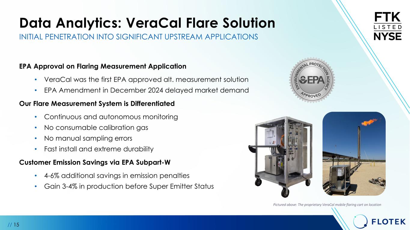 数据分析:VeraCal耀斑解决方案//15初始渗透成重要的上流应用上图:位置上的专有VeraCal移动耀斑推车EPA对耀斑测量应用程序的批准• VeraCal是第一个获得EPA批准的alt.测量解决方案• 2024年12月的EPA修正案推迟了市场需求我们的耀斑测量系统是差异化的•连续和自主监测•没有消耗性校准气体•没有手动采样错误•通过EPA Subpart-W快速安装和极端耐用的客户排放节省•额外节省4-6 %的排放罚款•在超级发射器状态之前获得3-4 %的生产