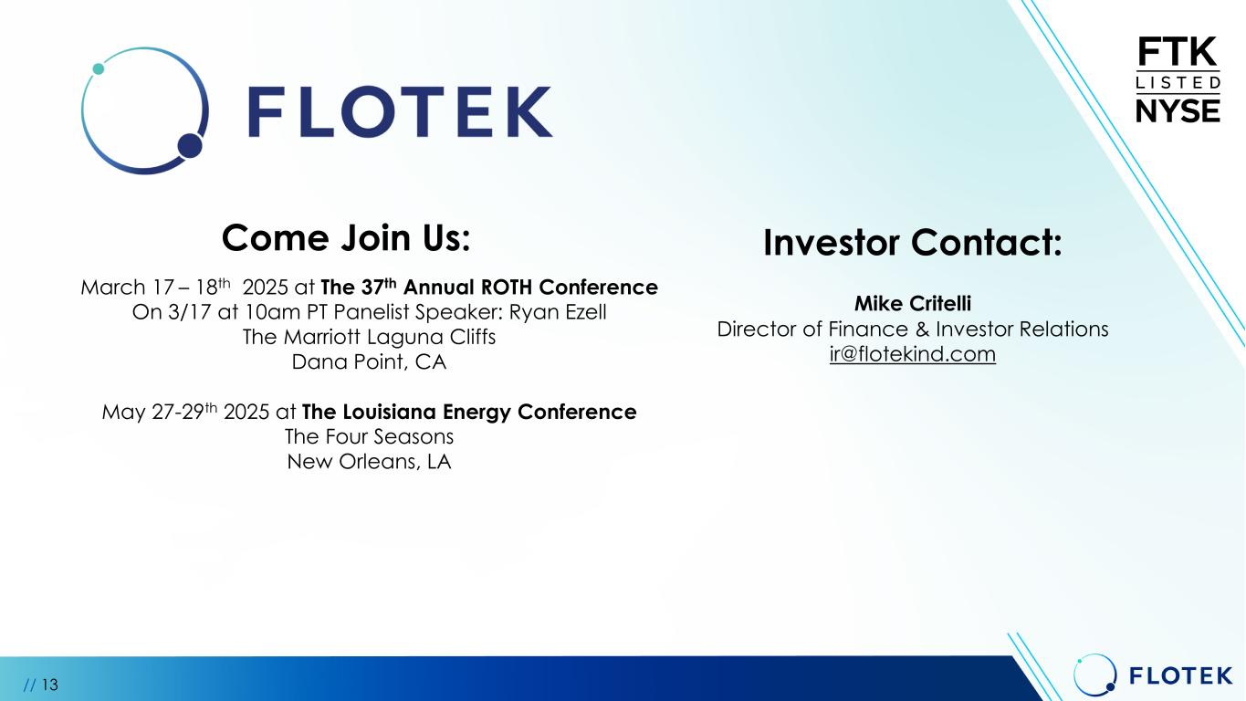 投资者联系人:Mike Critelli财务和投资者关系总监ir@flotekind.com//13来加入我们:2025年3月17日– 18日,在3/17上午10点举行的第37届ROTH年度会议上,PT小组成员演讲者:Ryan Ezell The 万豪酒店 Laguna Cliffs 达纳 Point,加利福尼亚州于2025年5月27日至29日在路易斯安那州能源会议上的四季新奥尔良,LA