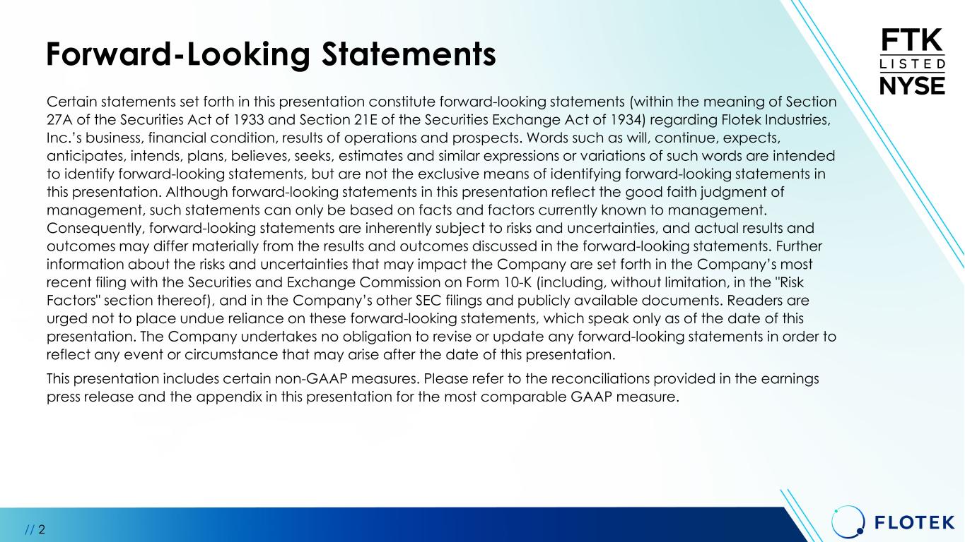 前瞻性陈述本演示文稿中列出的某些陈述构成有关Flotek Industries, Inc.的业务、财务状况、经营业绩和前景的前瞻性陈述(在1933年证券法第27A条和1934年证券交易法第21E条的含义内)。will、continue、expect、anticate、intend、plan、believe、seek、estimate等词语以及此类词语的类似表述或变体旨在识别前瞻性陈述,但不是本演示文稿中识别前瞻性陈述的唯一手段。尽管本演示文稿中的前瞻性陈述反映了管理层的善意判断,但此类陈述只能基于管理层目前已知的事实和因素。因此,前瞻性陈述本质上受到风险和不确定性的影响,实际结果和结果可能与前瞻性陈述中讨论的结果和结果存在重大差异。有关可能影响公司的风险和不确定性的进一步信息,请参见公司最近提交给美国证券交易委员会的10-K表格文件(包括但不限于其中的“风险因素”部分),以及公司提交给美国证券交易委员会的其他文件和公开文件。敦促读者不要过分依赖这些前瞻性陈述,这些陈述仅在本演示文稿发布之日发表。公司不承担修改或更新任何前瞻性陈述以反映本演示文稿日期之后可能出现的任何事件或情况的义务。本演示文稿包括某些非公认会计原则措施。请参阅收益新闻稿和本演示文稿附录中提供的对账,了解最具可比性的GAAP衡量标准。// 2