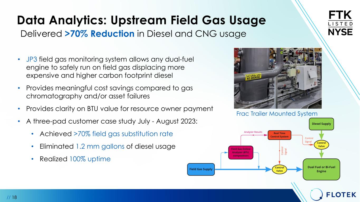 • JP3现场气体监测系统允许任何双燃料发动机在取代更昂贵和碳足迹更高的柴油的现场气体上安全运行•与气相色谱和/或资产故障相比,提供了有意义的成本节约•提供了资源所有者付款的BTU价值的明确性• 2023年7月至8月的三垫客户案例研究:•实现了> 70%的现场气体替代率•消除了1.2毫米加仑的柴油使用量•实现了100%的正常运行时间数据分析:上游现场气体使用量//18交付的柴油和CNG使用量减少> 70%压裂拖车安装系统